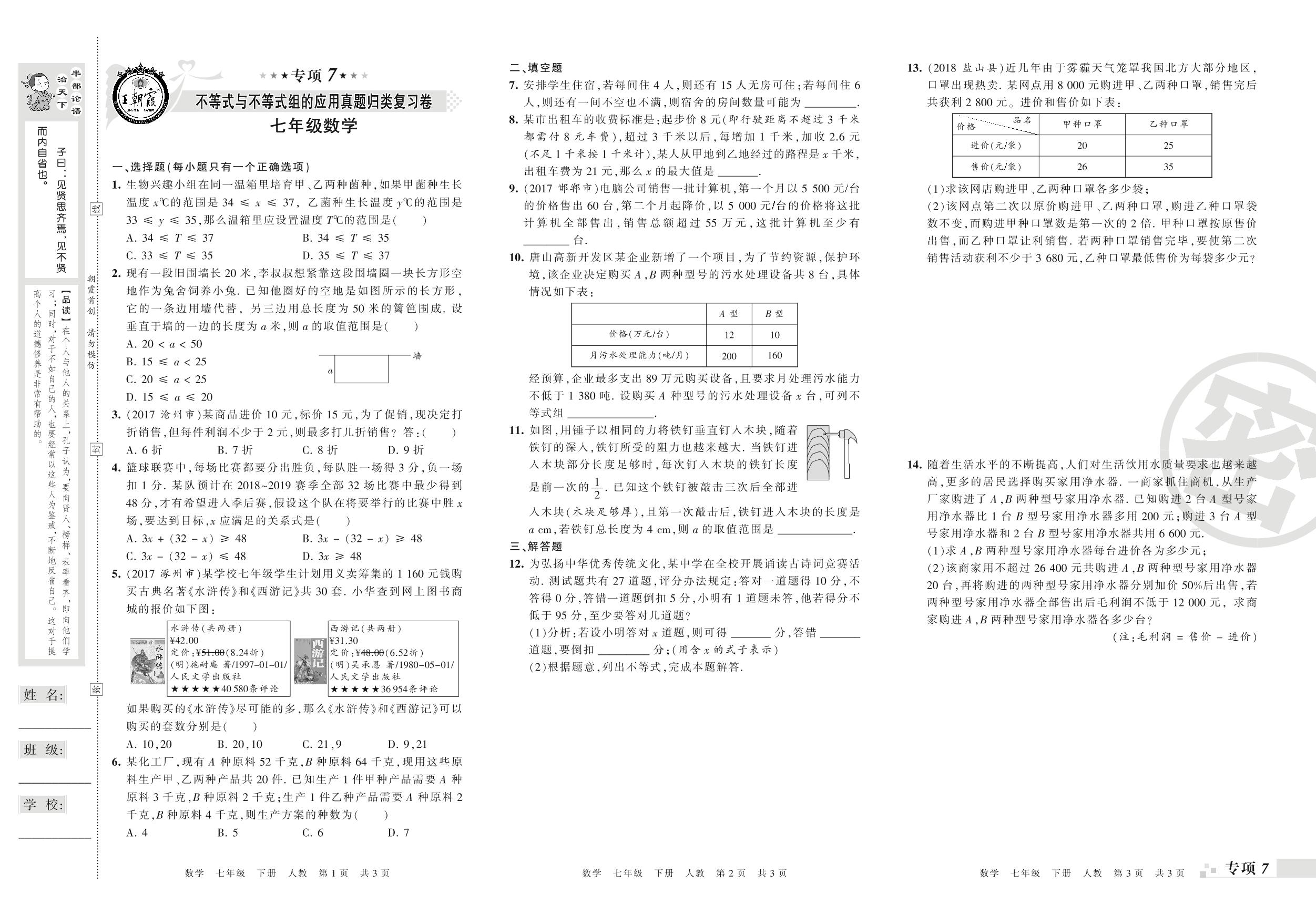 王朝霞期末专项卷——不等式与不等式组的应用 数据的收集、整理与描述真题归类复习卷七年级下册数学(人教版)_R210805161937【0】