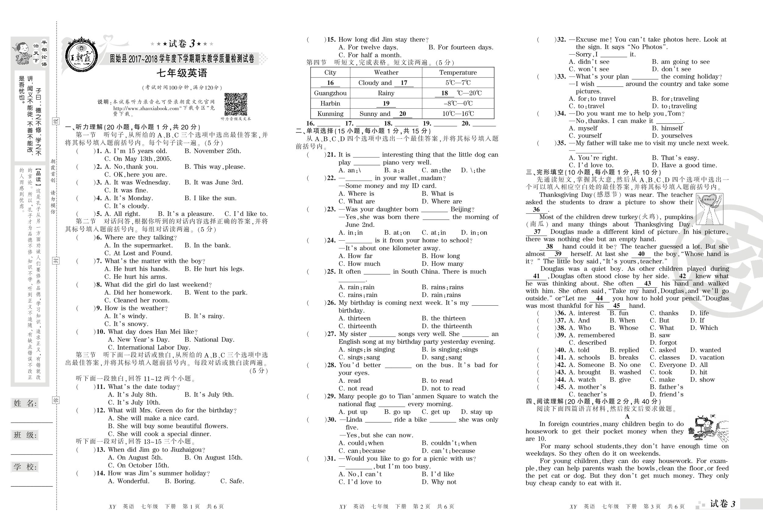 2017-2018学年第二学期信阳市固始县七年级英语试卷(新课版)【3】