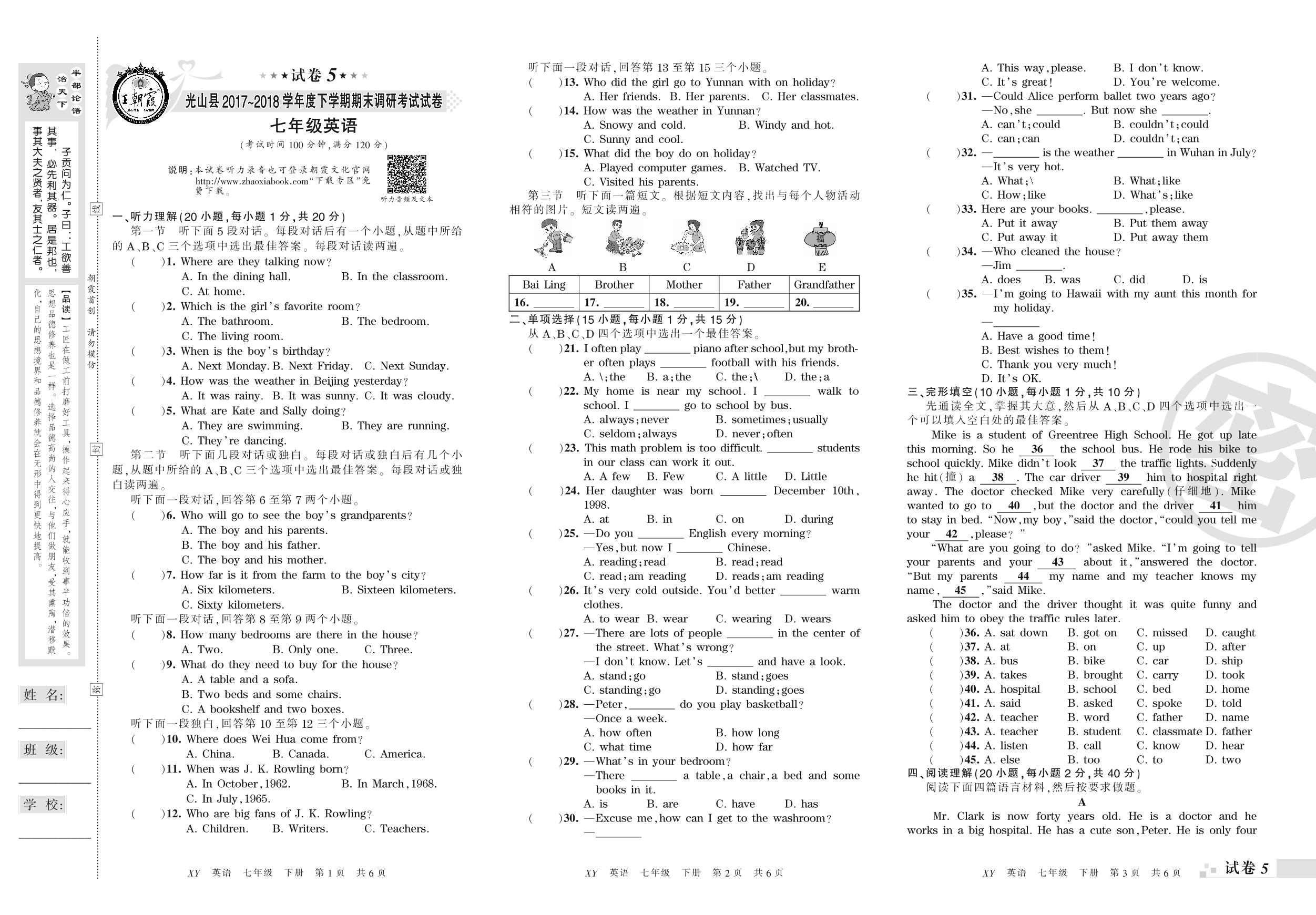 2017-2018学年第二学期信阳市光山县七年级英语试卷(新课版)【5】