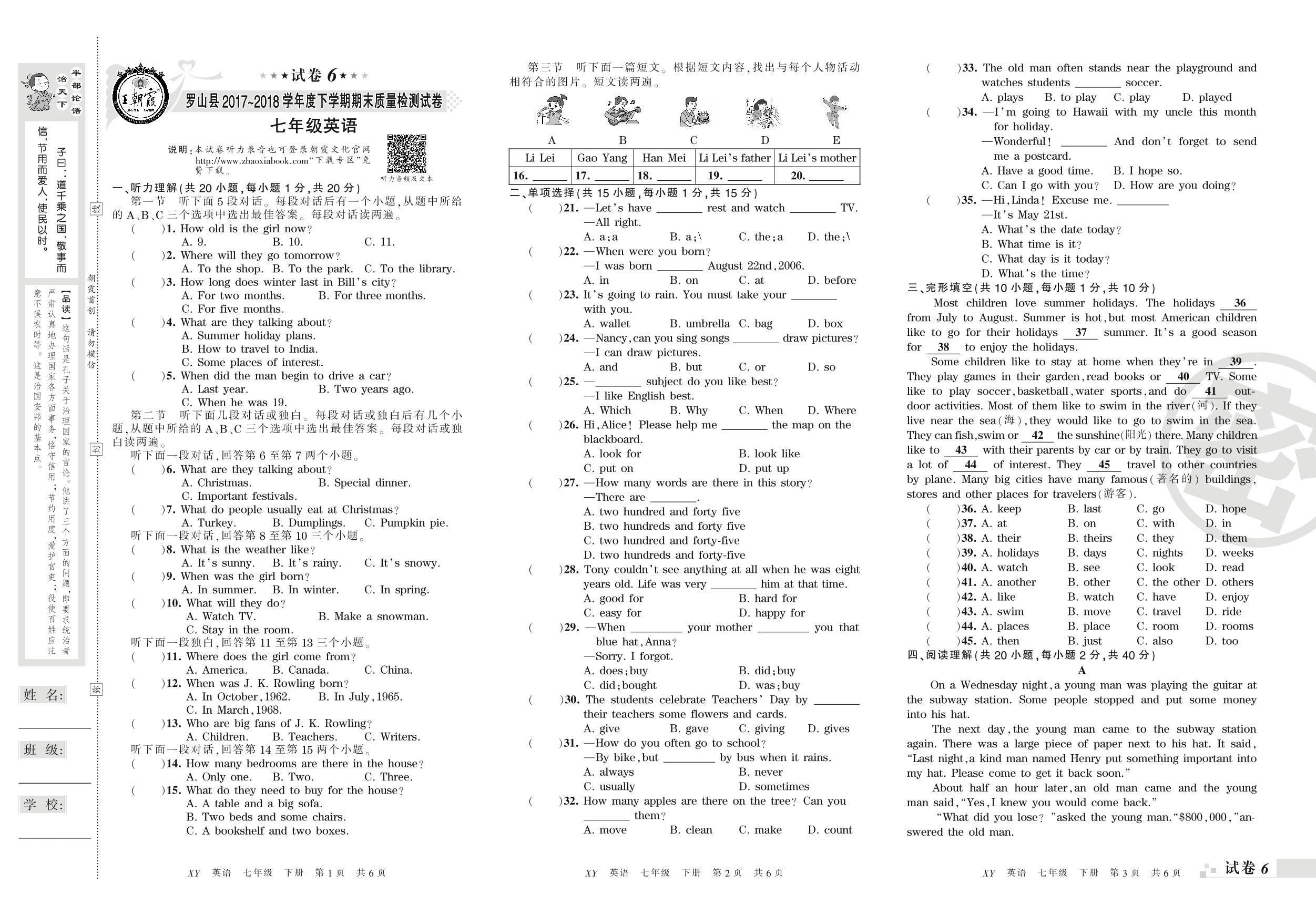 2017-2018学年第二学期信阳市罗山县七年级英语试卷(新课版)【6】