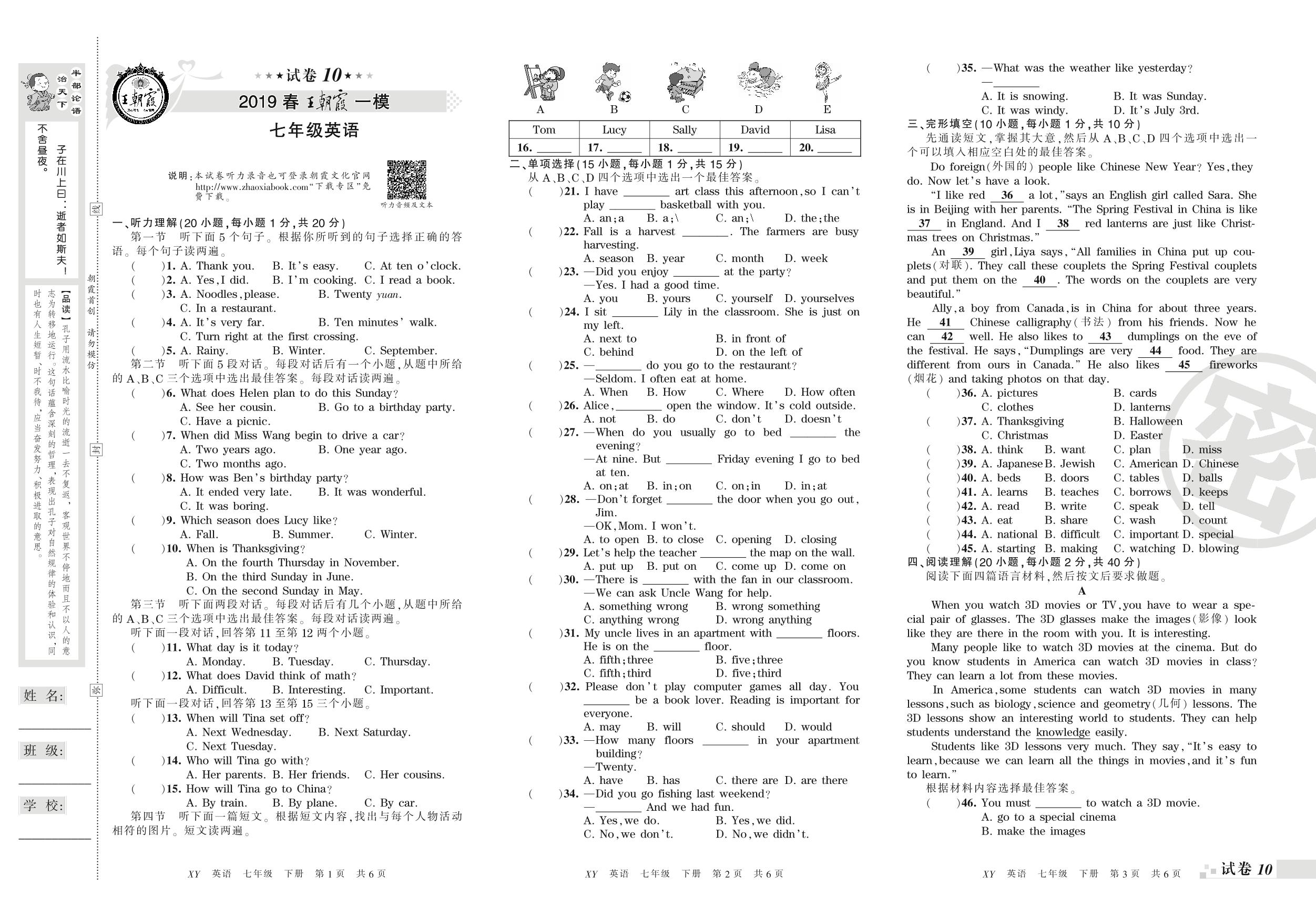 王朝霞期末模拟卷七年级下册英语(新课版)【10】