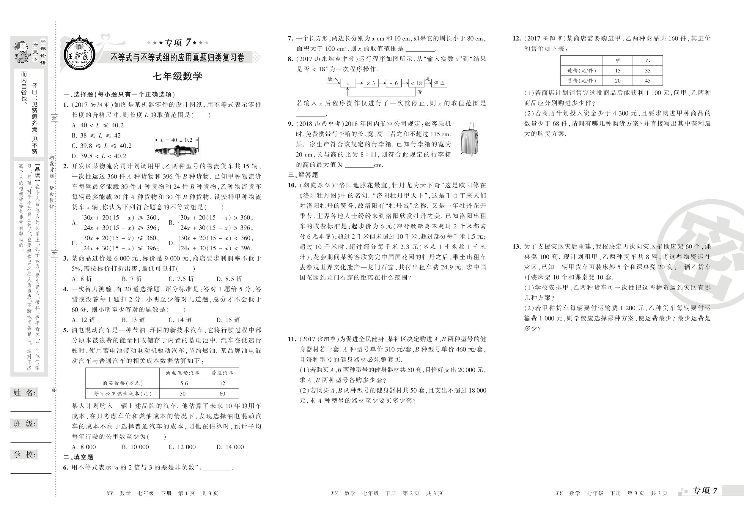 王朝霞期末专项卷——不等式与不等式组的应用 数据的收集、整理与描述真题归类复习卷七年级下册数学(人教版)_R210805162354【0】