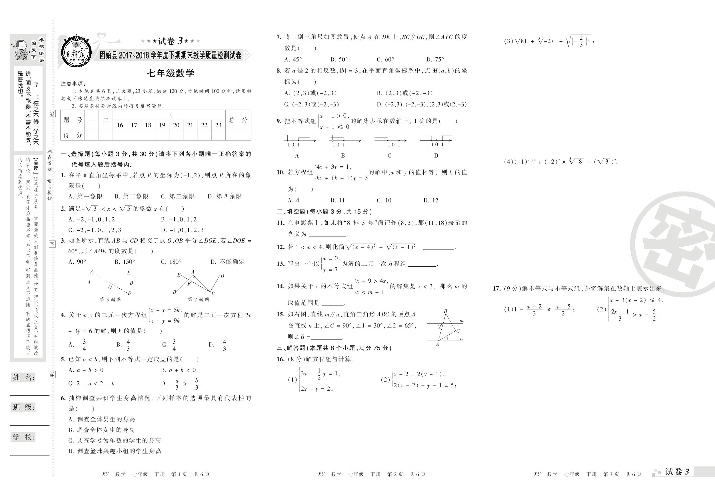2017-2018学年第二学期信阳市固始县七年级数学试卷(人教版)【3】