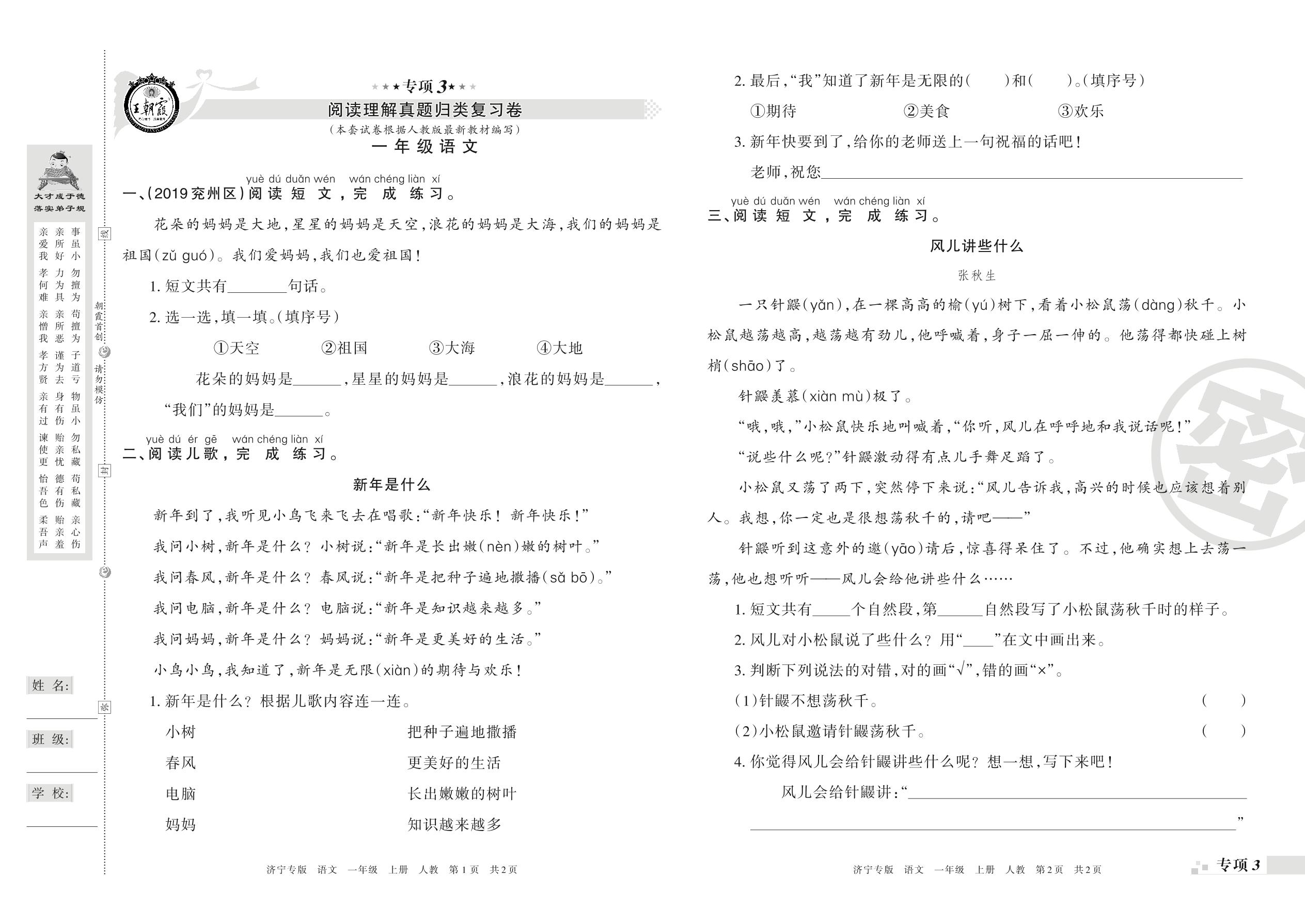 王朝霞期末专项卷——阅读理解、写话真题归类复习一年级上册语文(人教版)_R210731174255【0】