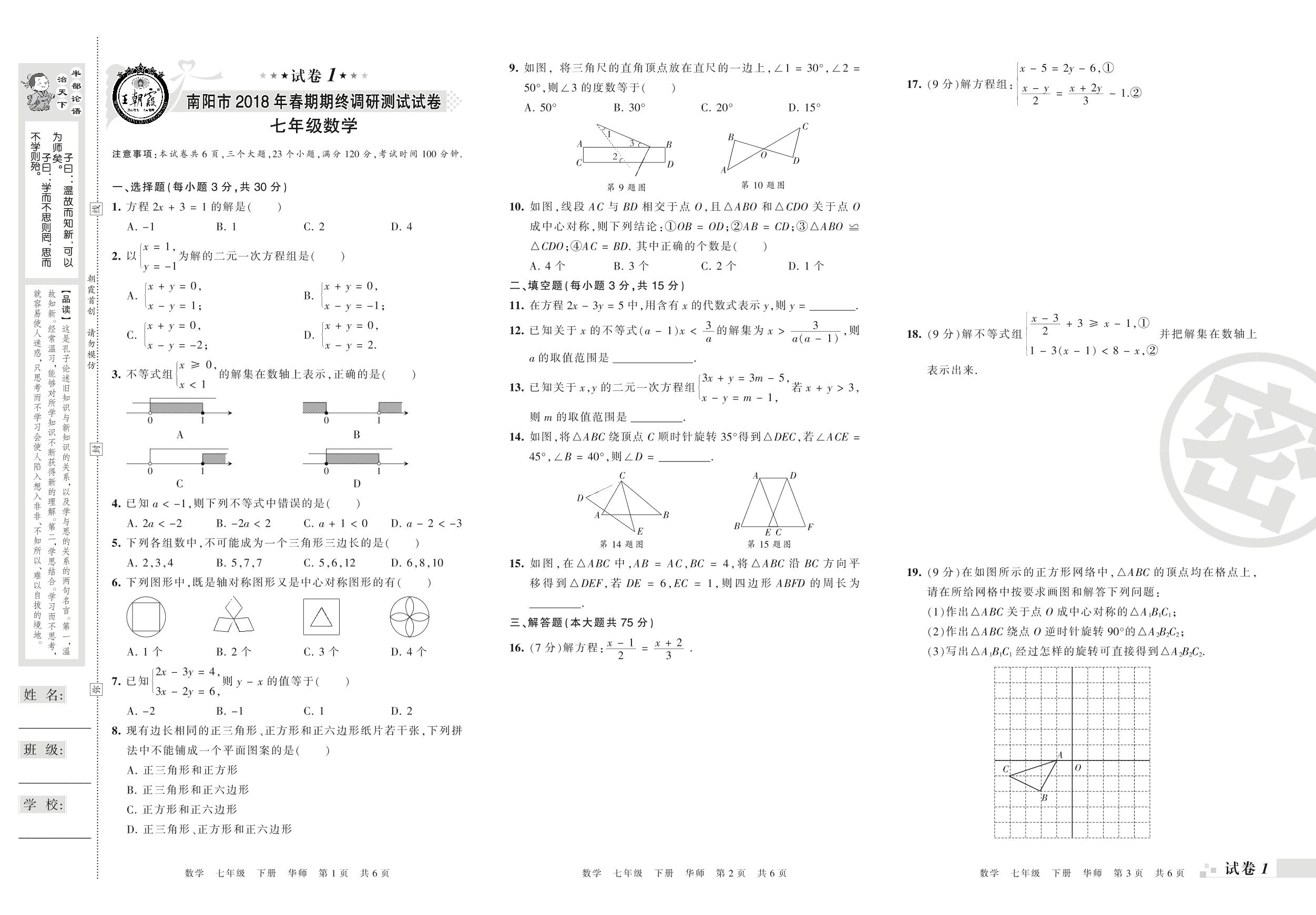 2017-2018学年第二学期南阳市七年级数学试卷(华师版)_R210805162617【1】