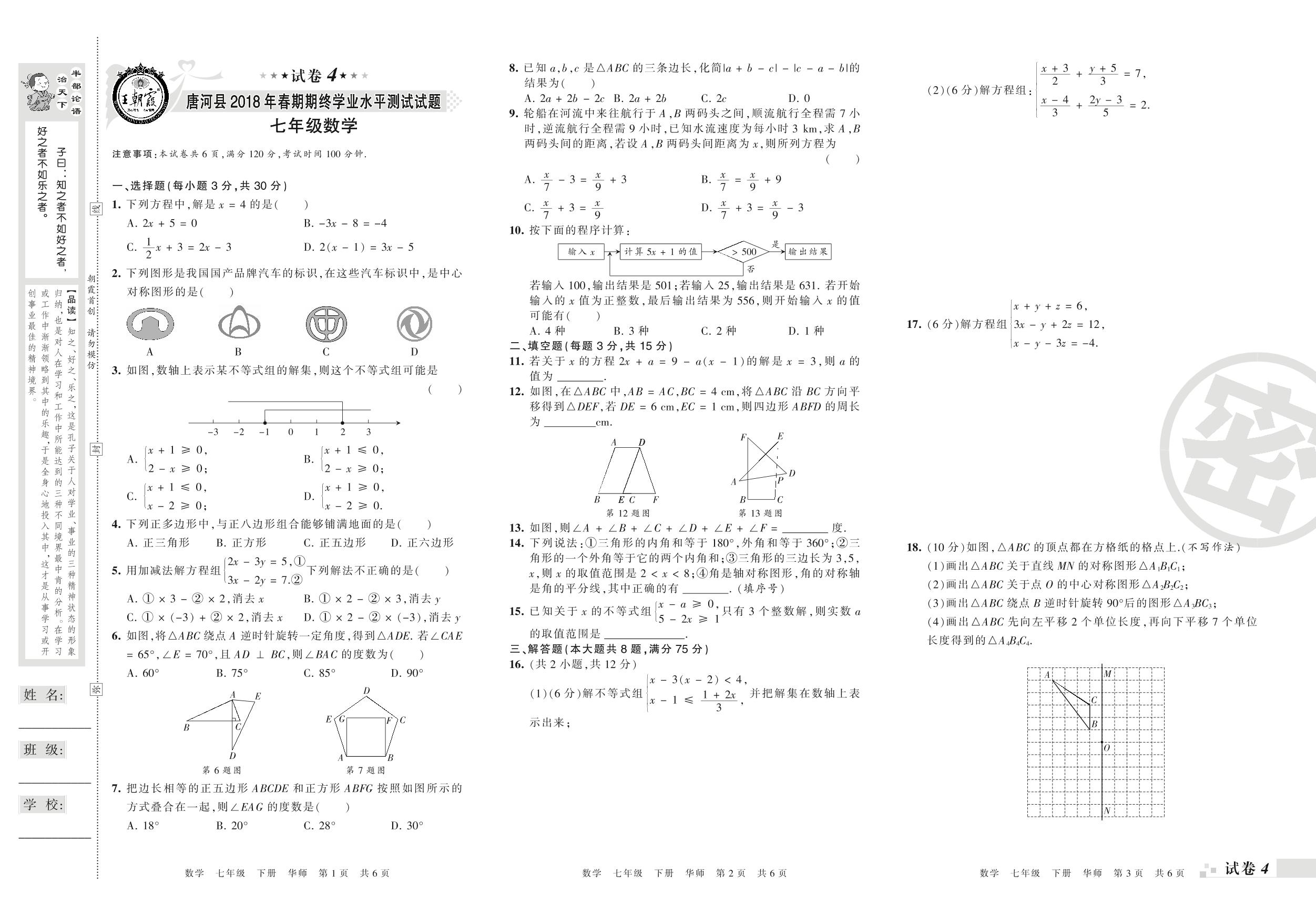 2017-2018学年第二学期南阳市唐河县七年级数学试卷(华师版)【4】
