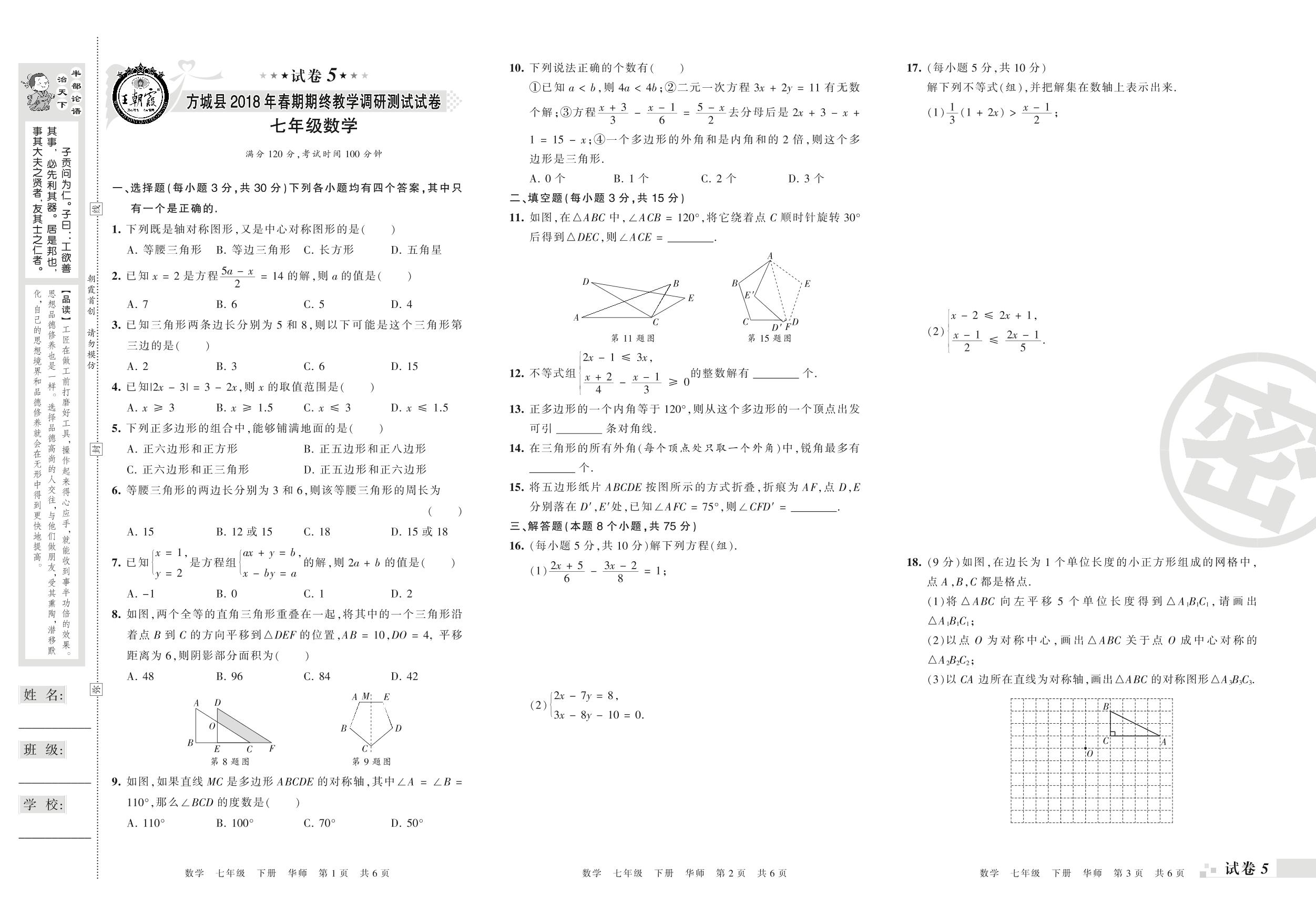 2017-2018学年第二学期南阳市方城县七年级数学试卷(华师版)【5】