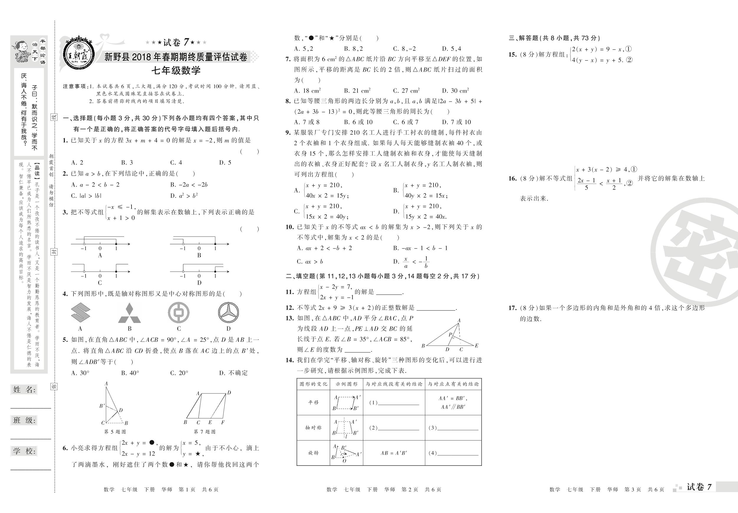 2017-2018学年第二学期南阳市新野县七年级数学试卷(华师版)【7】