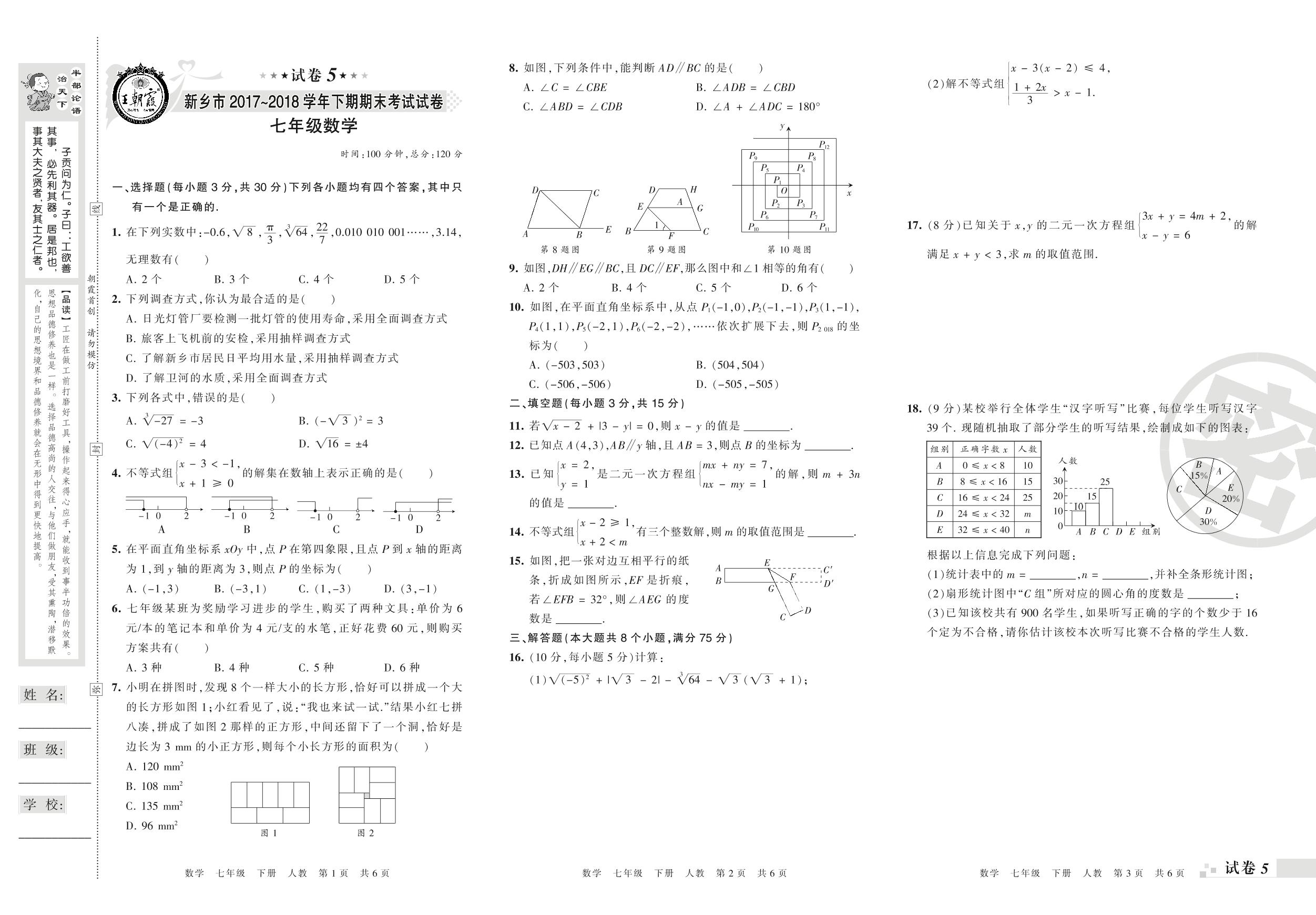 2017-2018学年第二学期新乡市七年级数学试卷(人教版)【5】