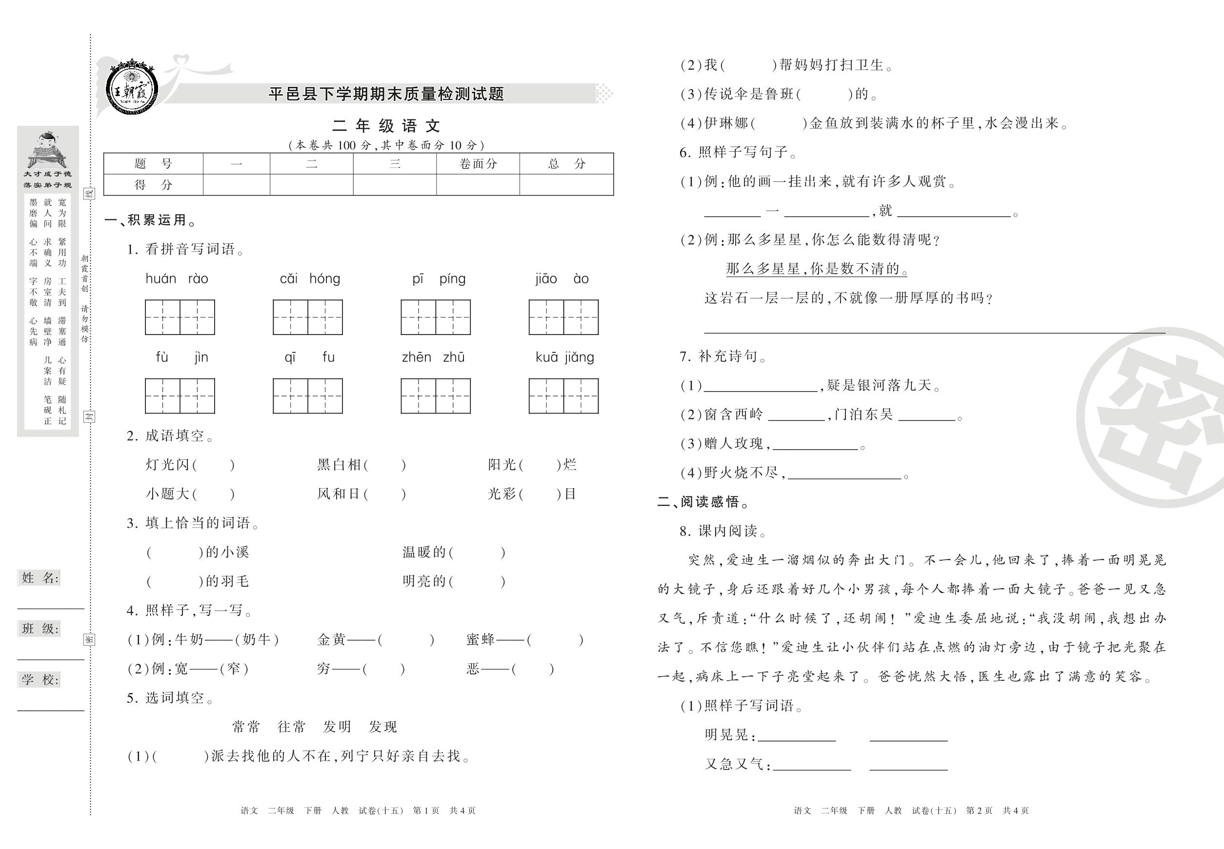 二年级语文人教版下册期末卷