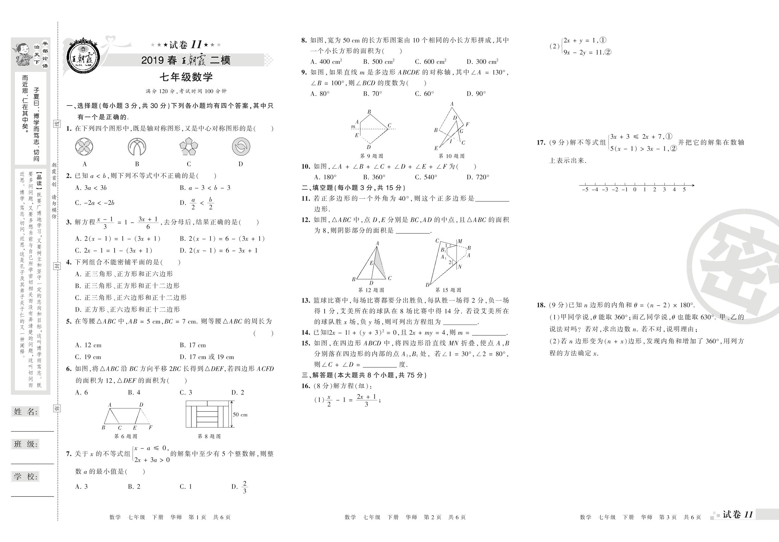 王朝霞期末模拟卷七年级下册数学(华师版)_R210805163013【11】