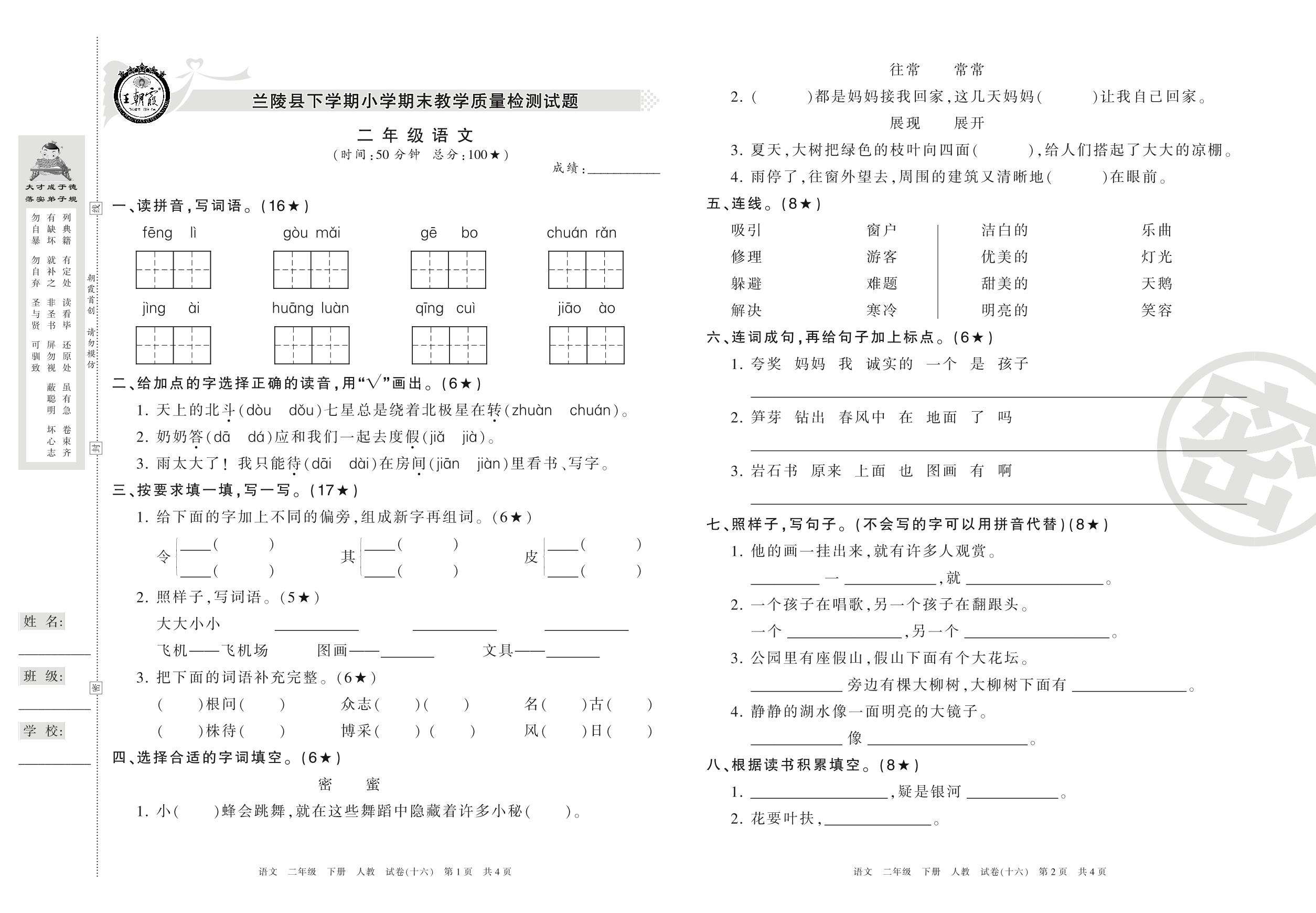 2015-2016学年第二学期临沂市兰陵县二年级语文试卷(人教版)【16】
