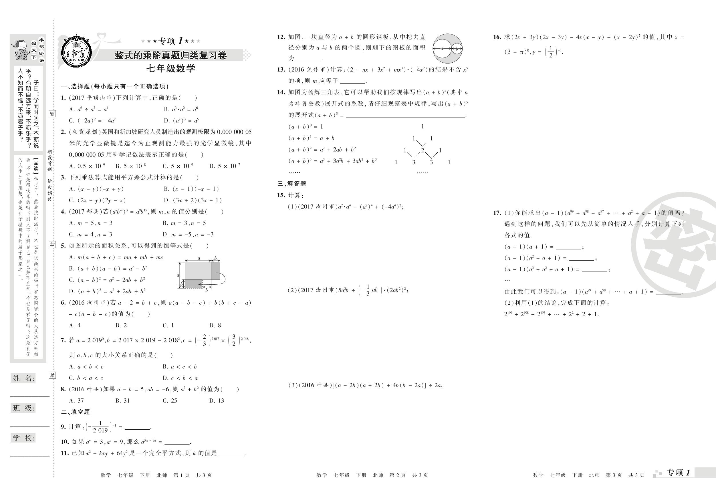 王朝霞期末专项卷——整式的乘除、相交线与平行线(一)真题归类复习卷七年级下册数学(北师版)_R210805163100【0】