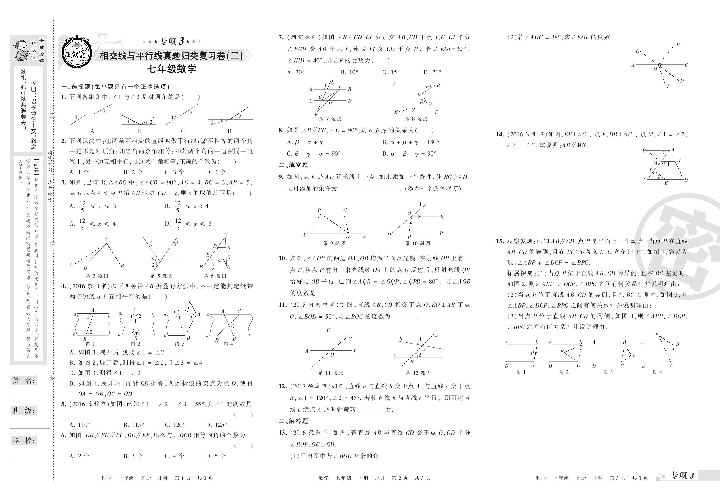 王朝霞期末专项卷——相交线与平行线(二)、变量之间的关系真题归类复习卷七年级下册数学(北师版)_R210805163105【0】