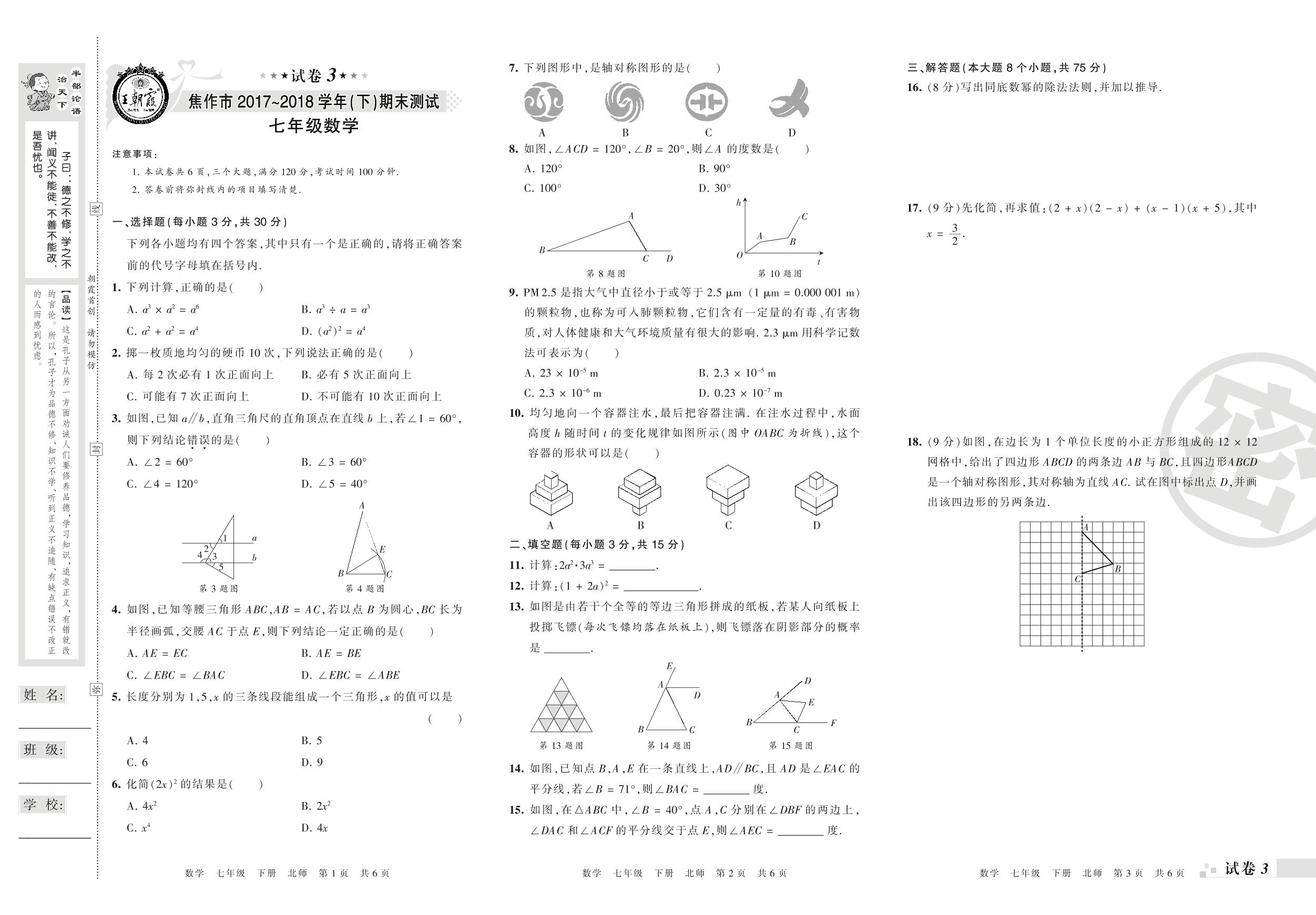 2017-2018学年第二学期焦作市七年级数学试卷(北师版)【3】