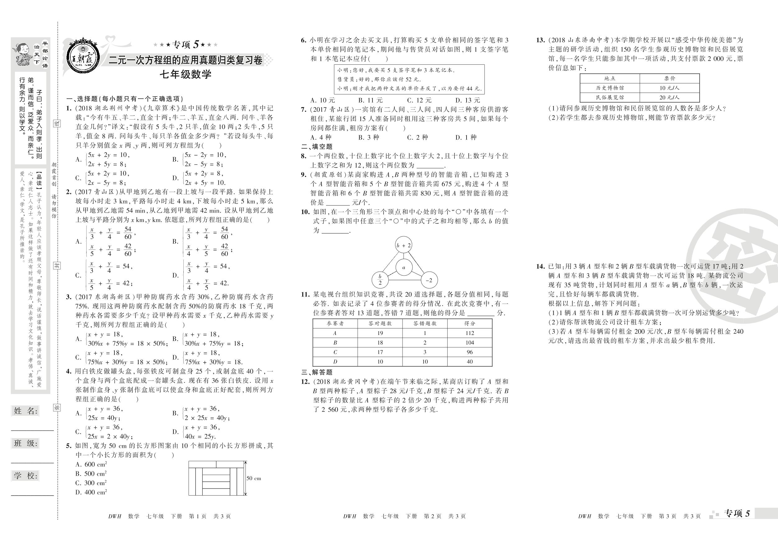 王朝霞期末专项卷——二元一次方程组的应用、不等式与不等式组的认识与解法真题归类复习卷七年级下册数学(人教版)_R210805163201【0】
