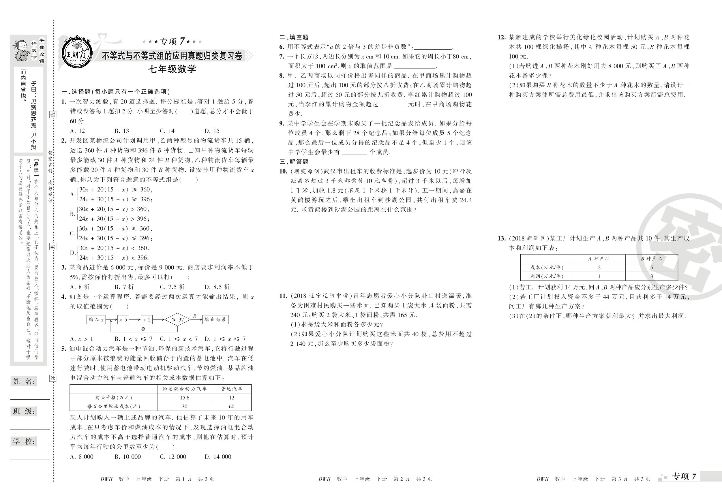 王朝霞期末专项卷——不等式与不等式组的应用 数据的收集、整理与描述真题归类复习卷七年级下册数学(人教版)_R210805163207【0】