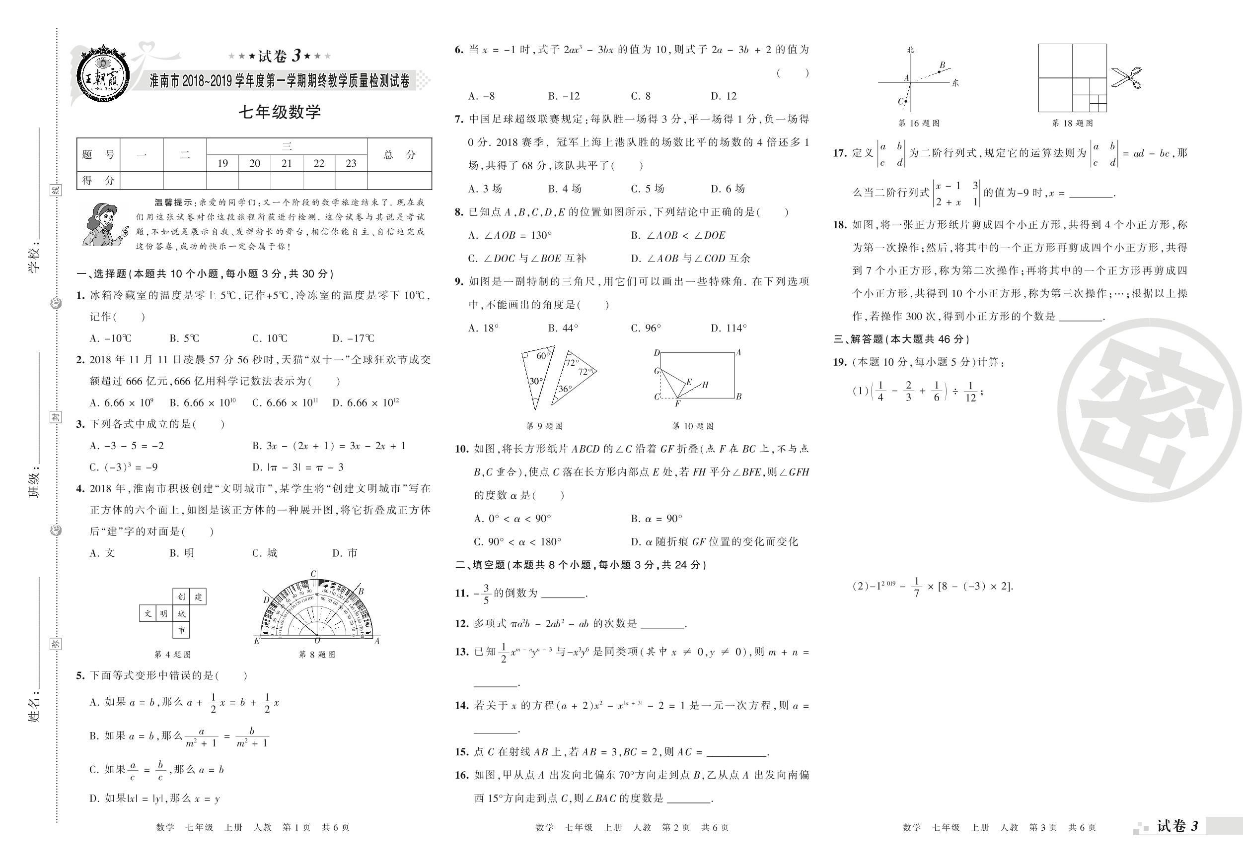 2018-2019学年第一学期淮南市七年级数学试卷(人教版)【3】