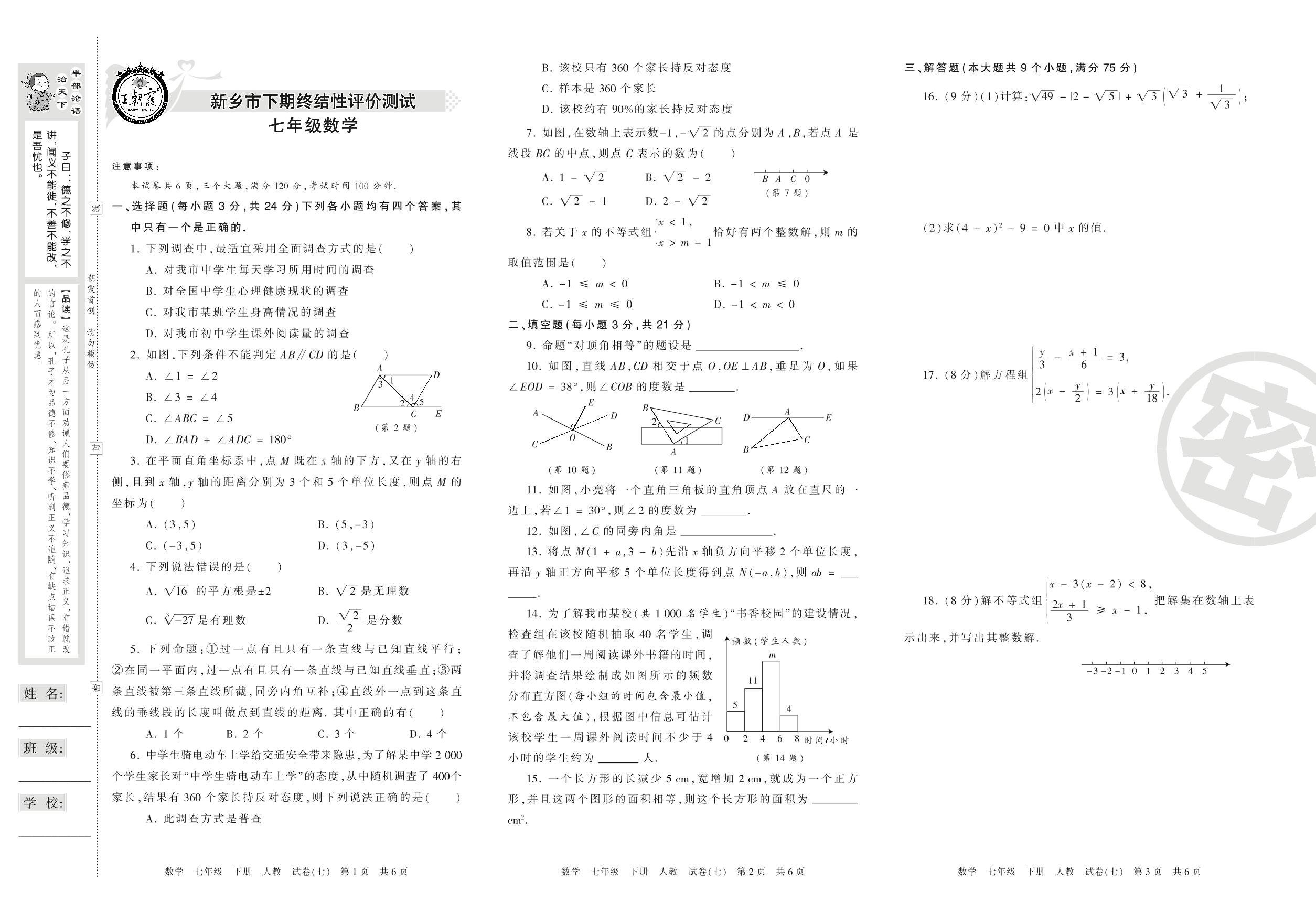 七年级数学人教版下册期末卷