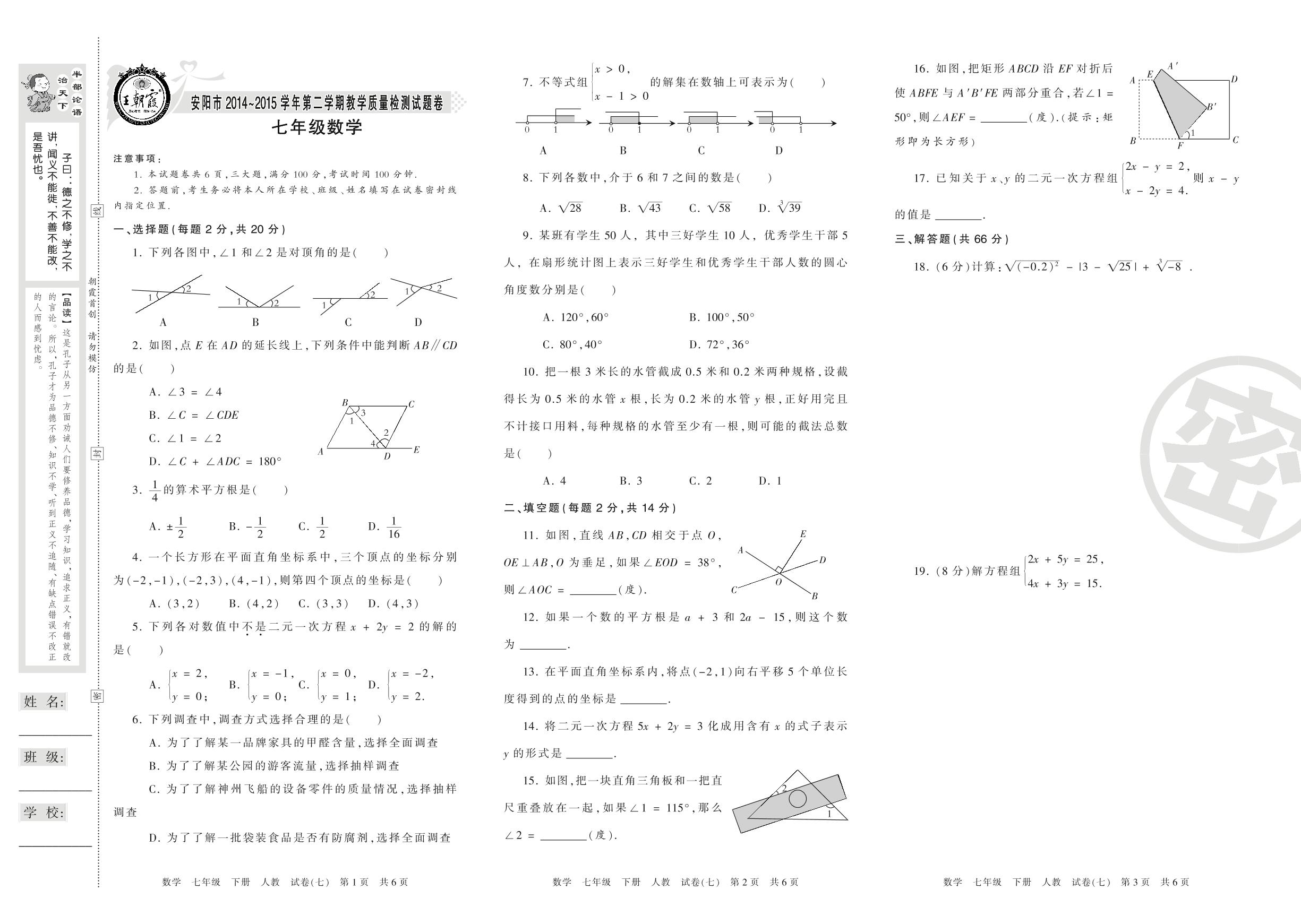 2014-2015学年第二学期安阳市七年级数学试卷(人教版)【7】