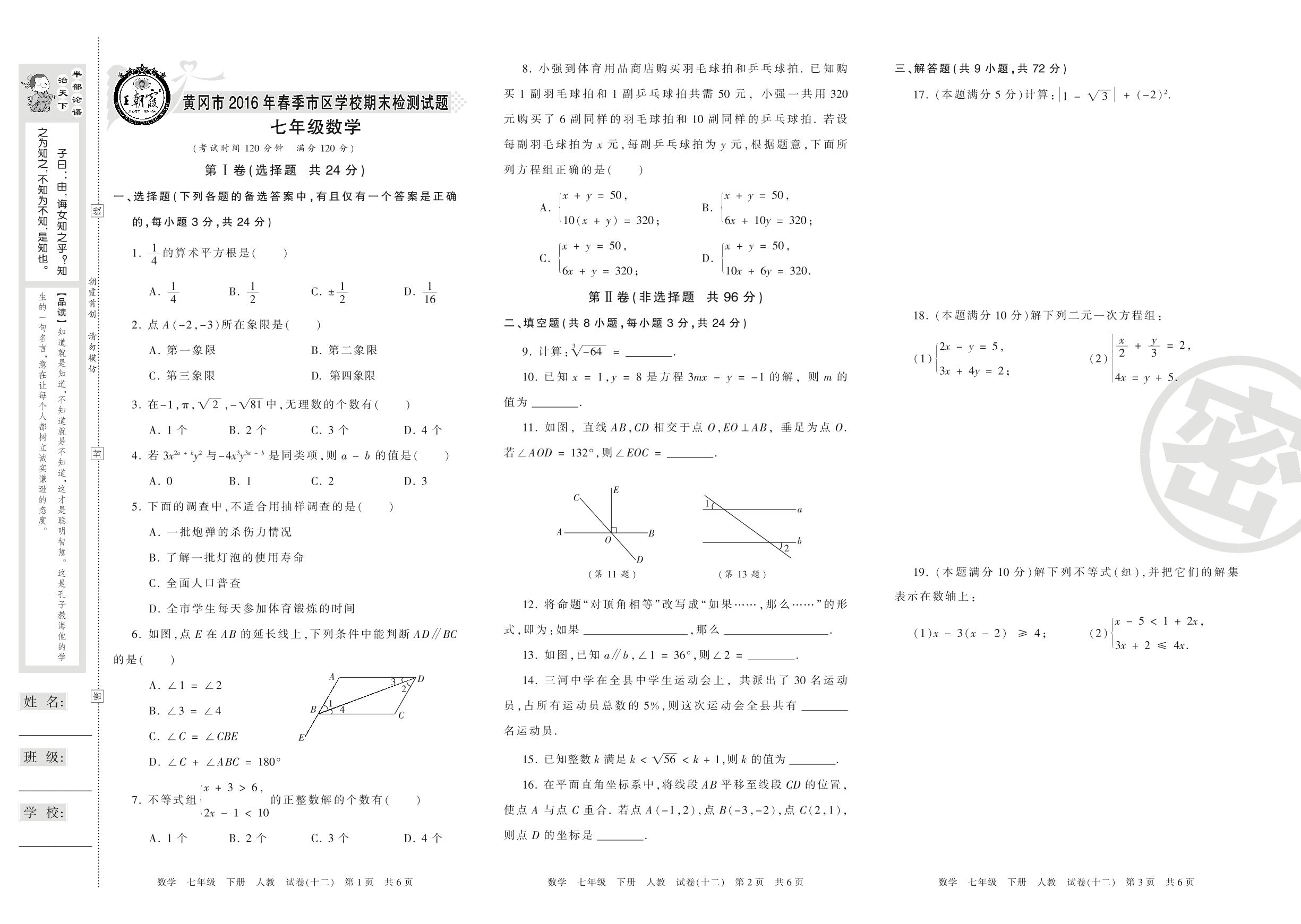 2015-2016学年第二学期黄冈市七年级数学试卷(人教版)【12】