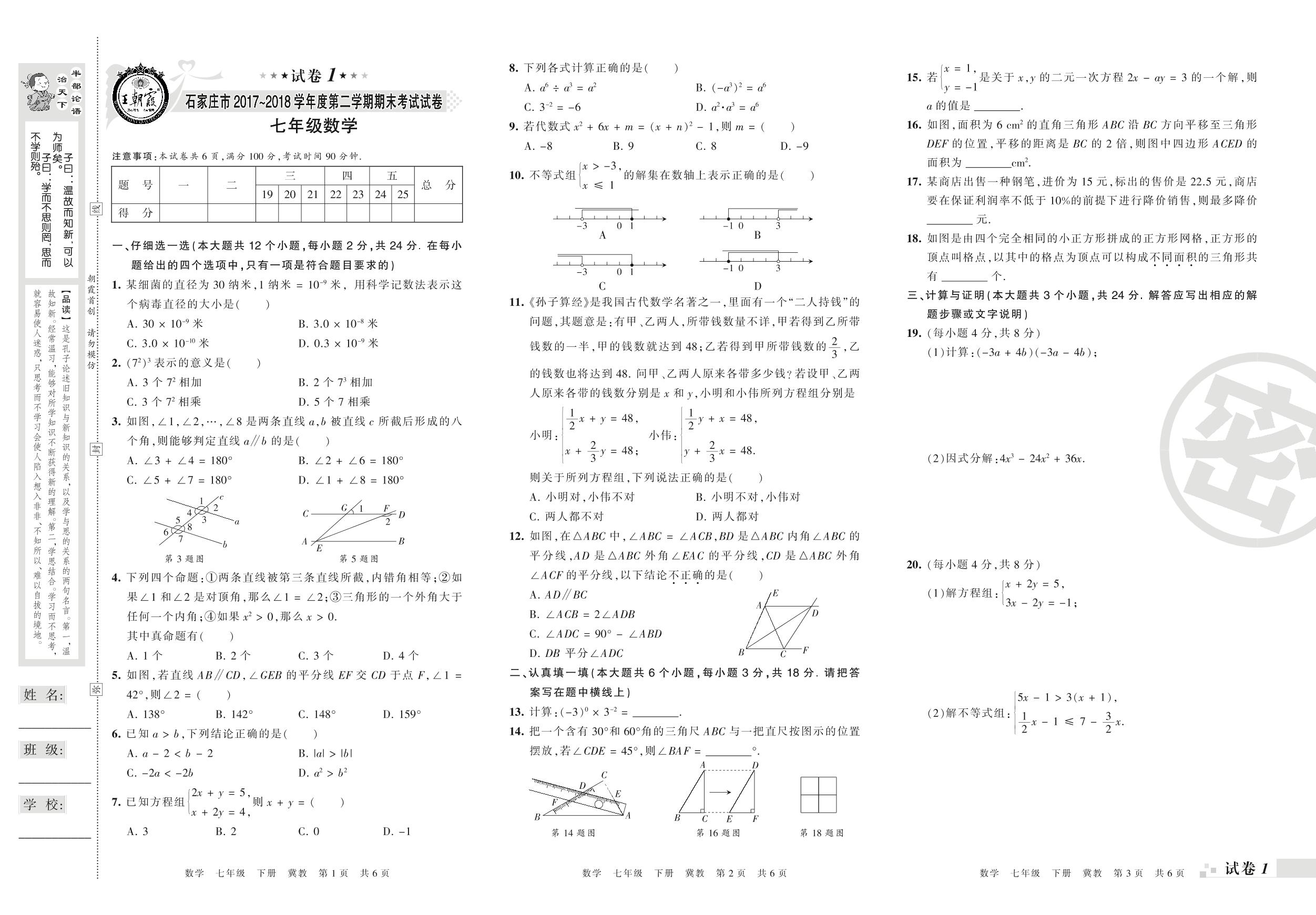 2017-2018学年第二学期石家庄市七年级数学试卷(冀教版)【1】