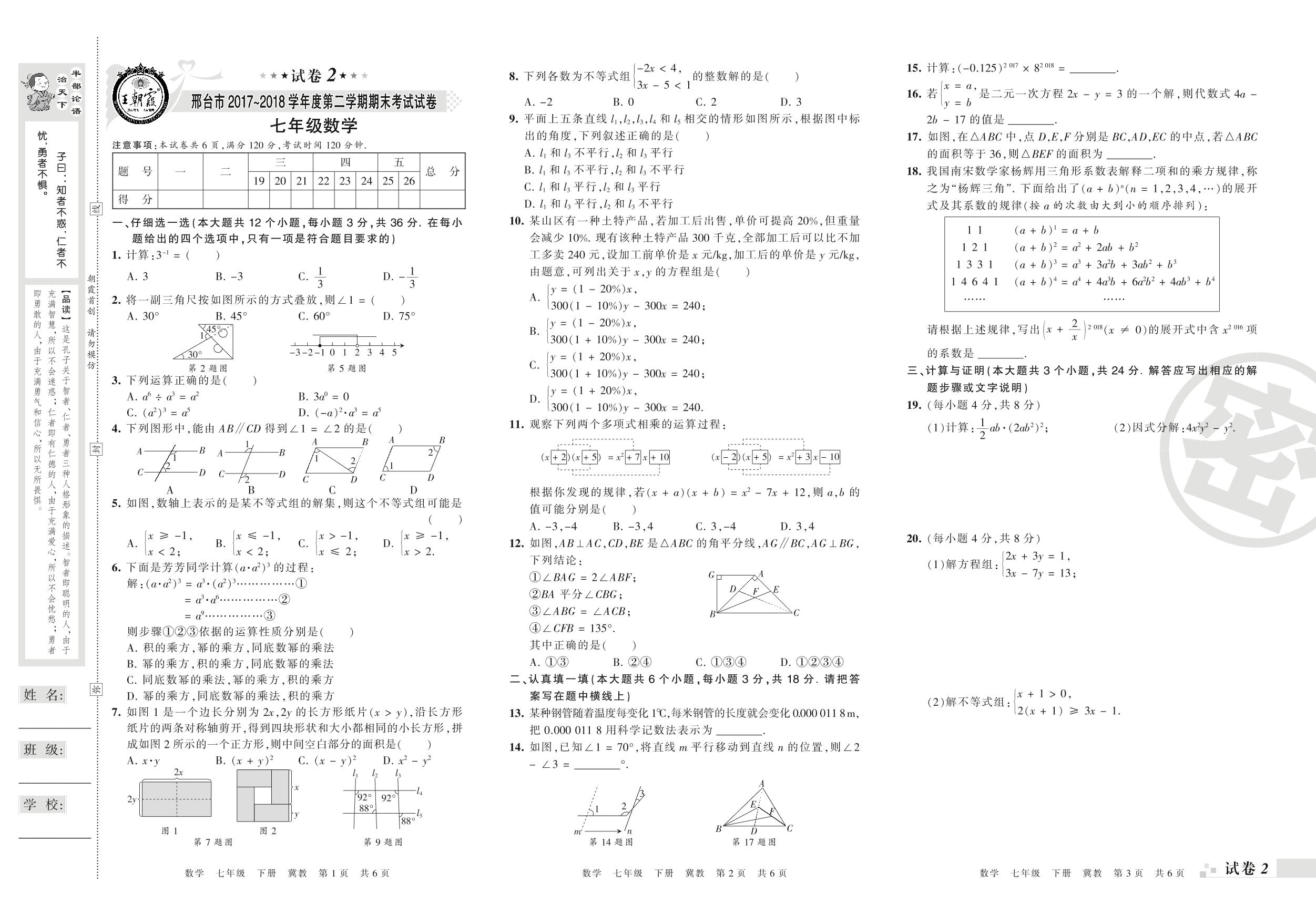 2017-2018学年第二学期邢台市七年级数学试卷(冀教版)【2】