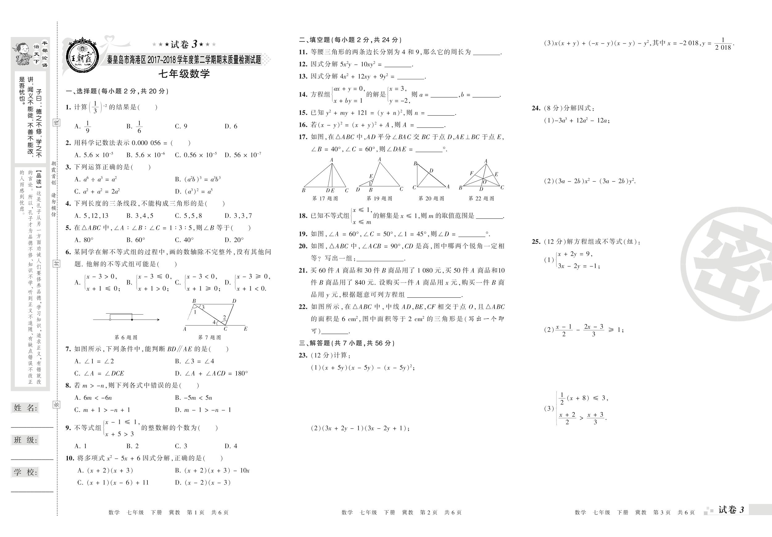 2017-2018学年第二学期秦皇岛市海港区七年级数学试卷(冀教版)【3】