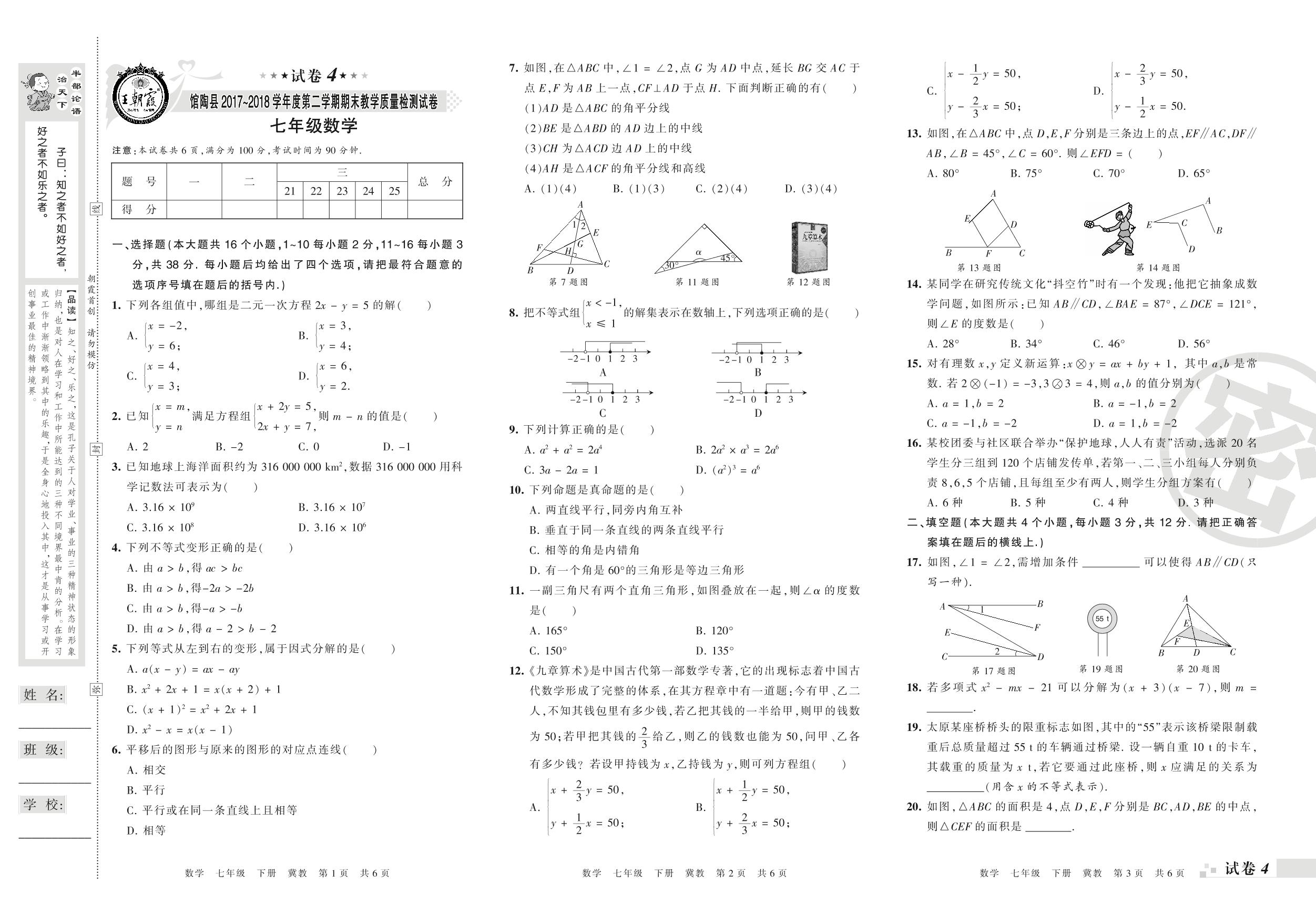 2017-2018学年第二学期邯郸市馆陶县七年级数学试卷(冀教版)【4】