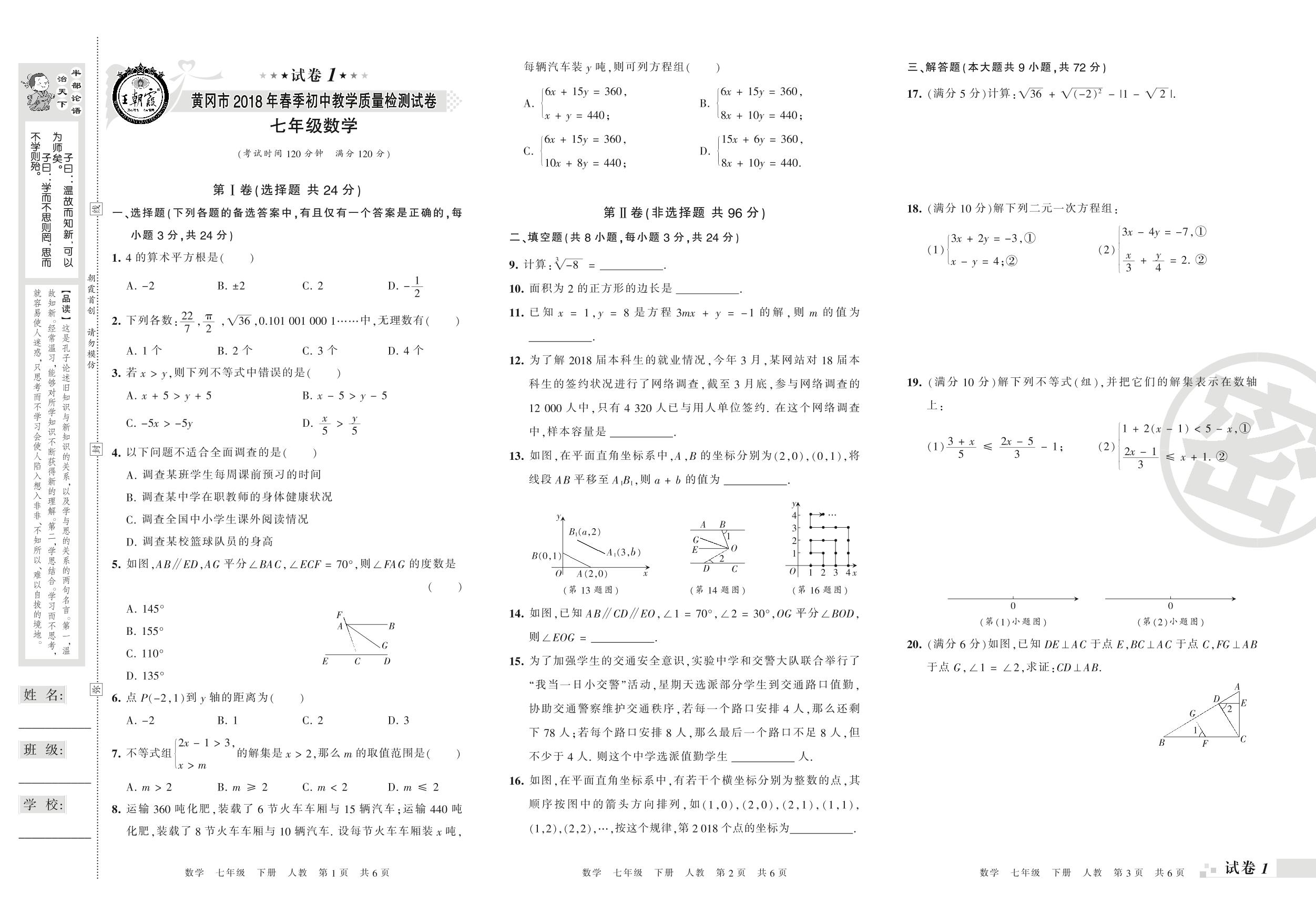 2017-2018学年第二学期黄冈市七年级数学试卷(人教版)【1】