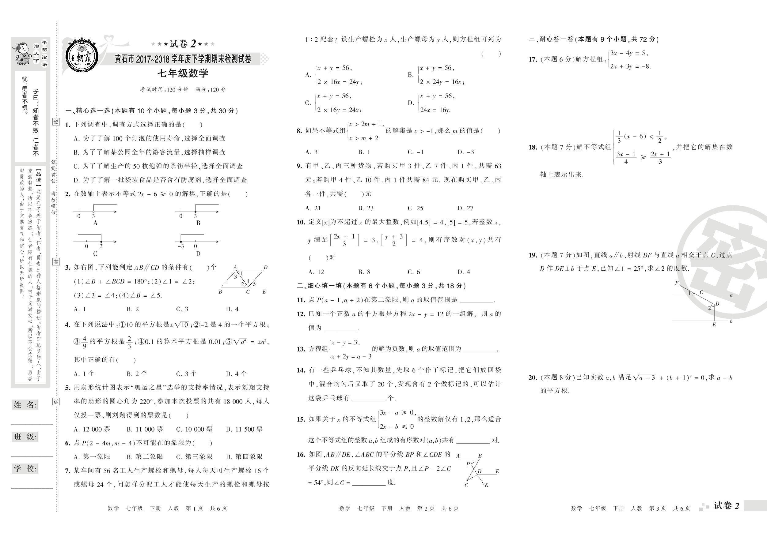 2017-2018学年第二学期黄石市七年级数学试卷(人教版)【2】