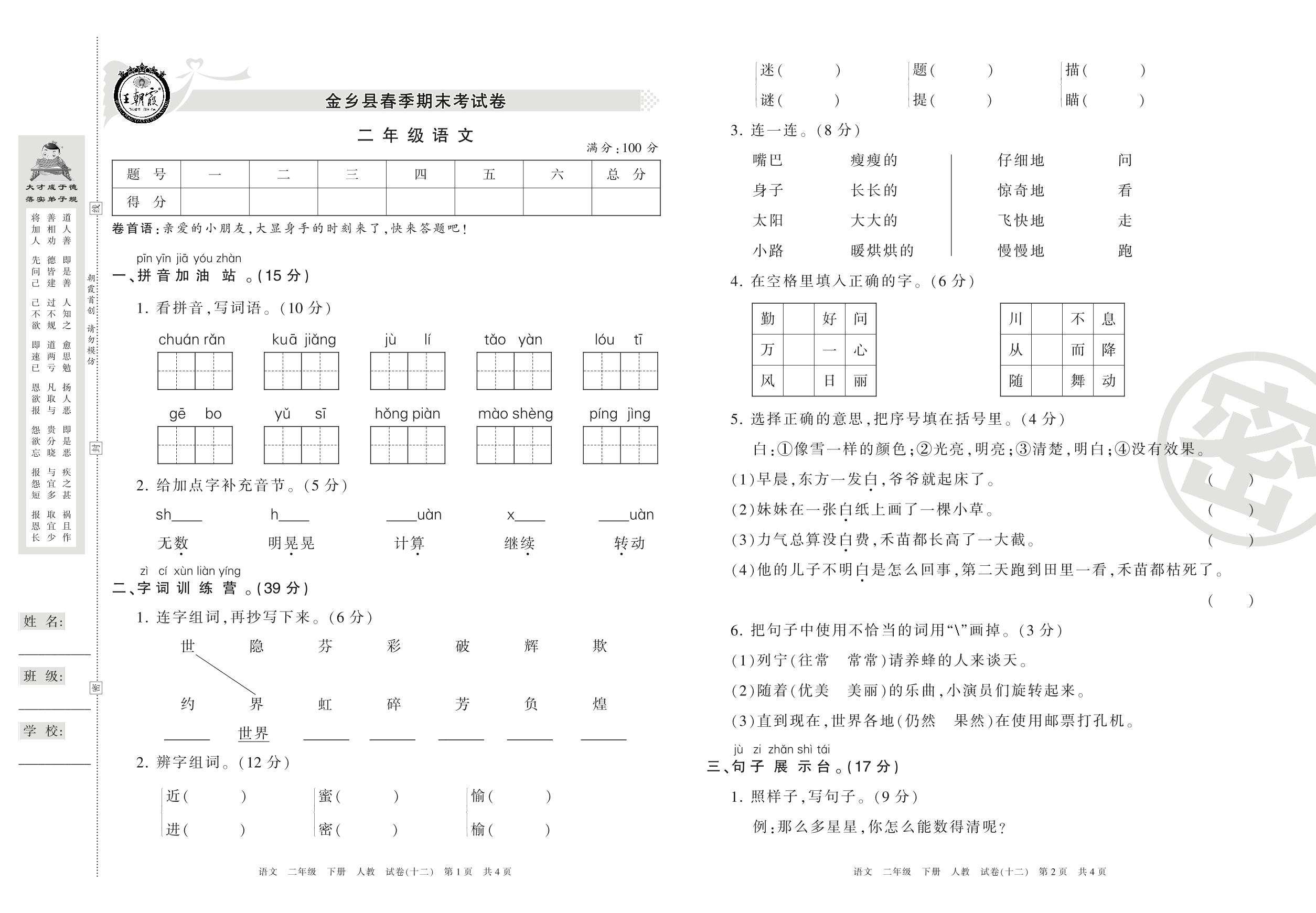 2015-2016学年第二学期济宁市金乡县二年级语文试卷(人教版)【12】
