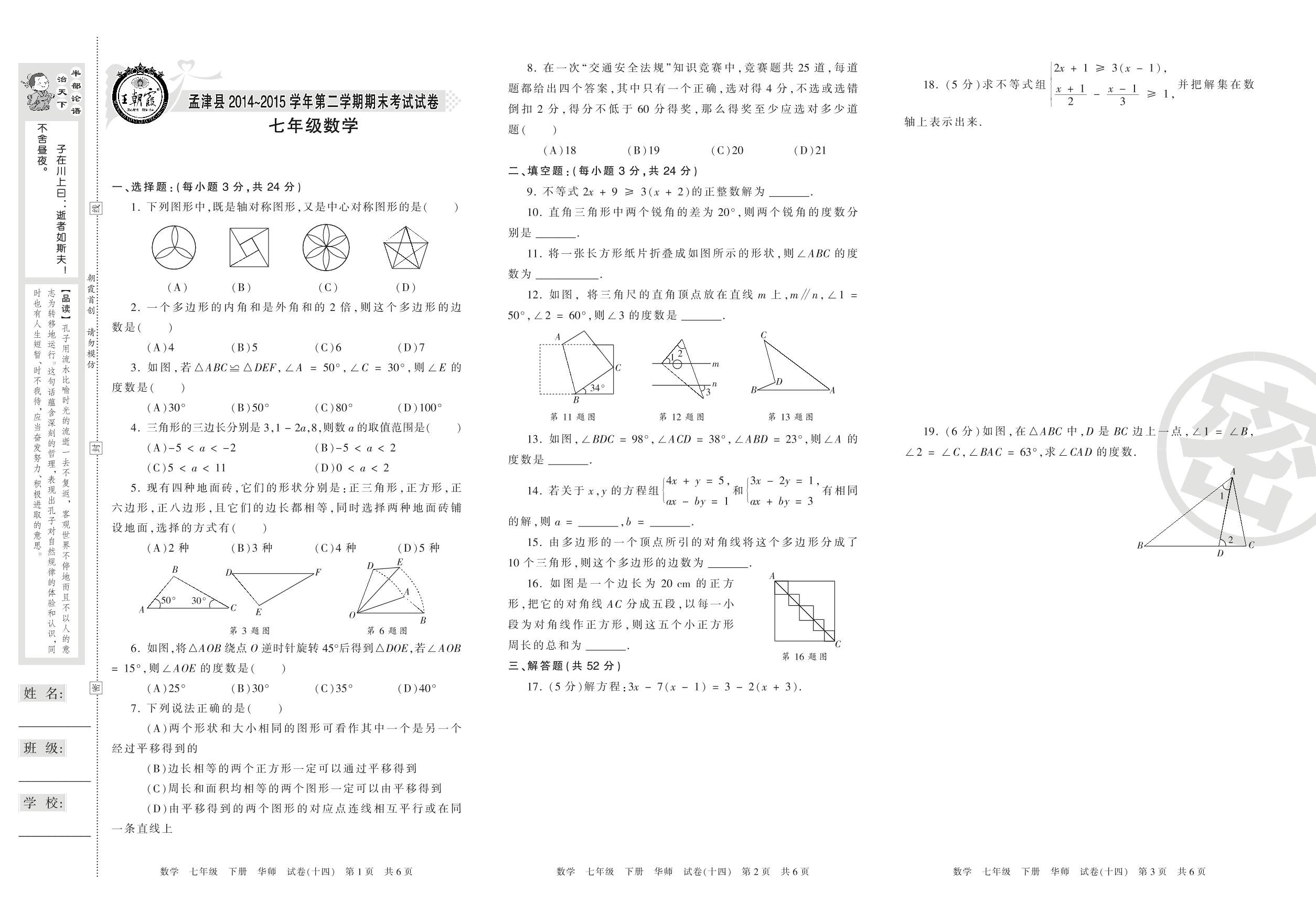 2014-2015学年第二学期洛阳市孟津县七年级数学试卷(华师版)【14】