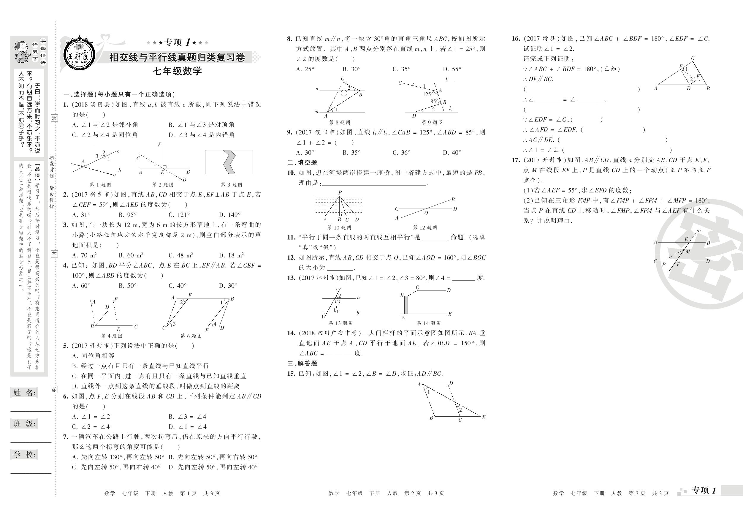王朝霞期末专项卷——相交线与平行线、实数真题归类复习卷七年级下册数学(人教版)_R210805164516【0】
