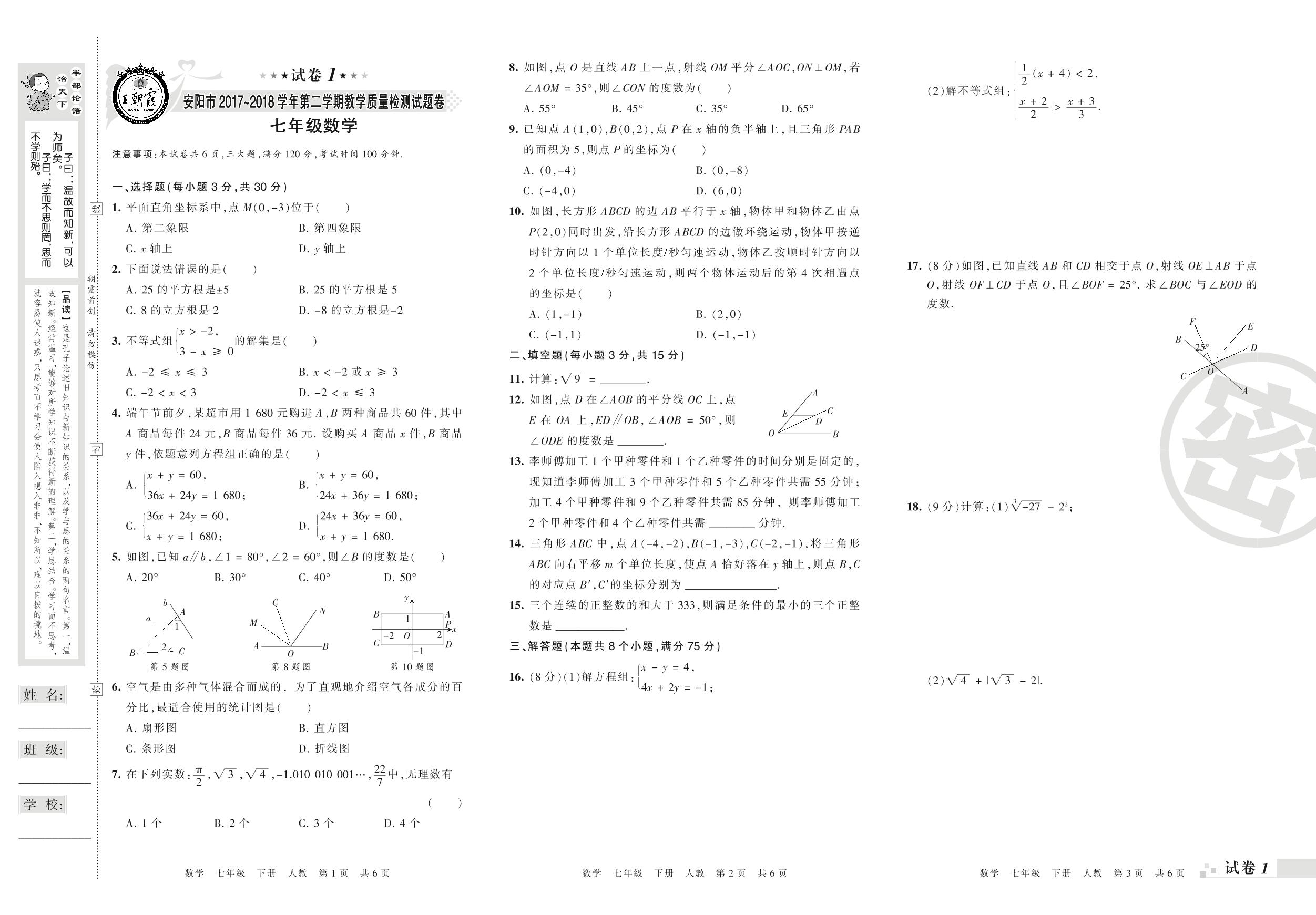 2017-2018学年第二学期安阳市七年级数学试卷(人教版)【1】