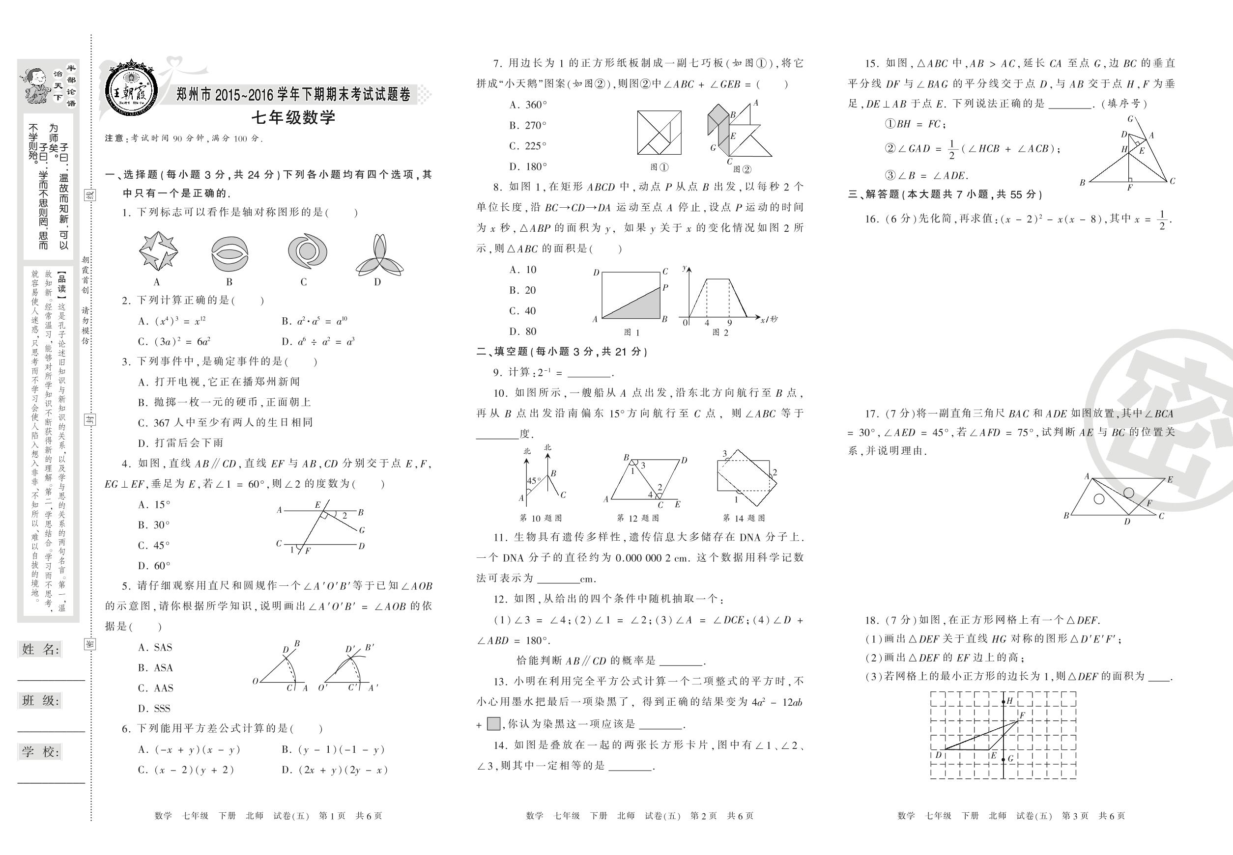 2015-2016学年第二学期郑州市七年级数学试卷(北师版)_R210805165622【5】