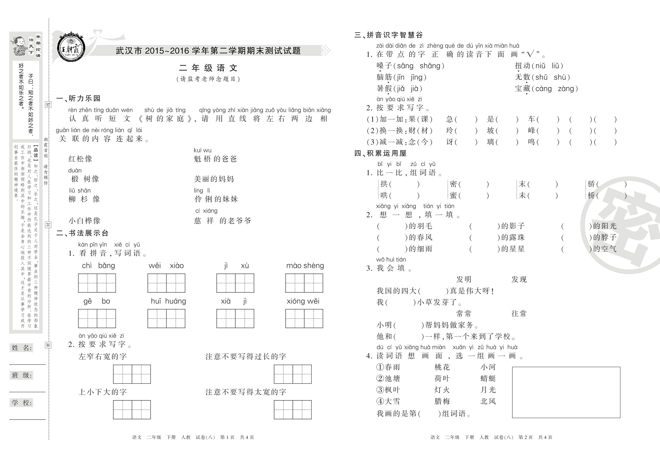 2015-2016学年第二学期武汉市二年级语文试卷(人教版)【8】