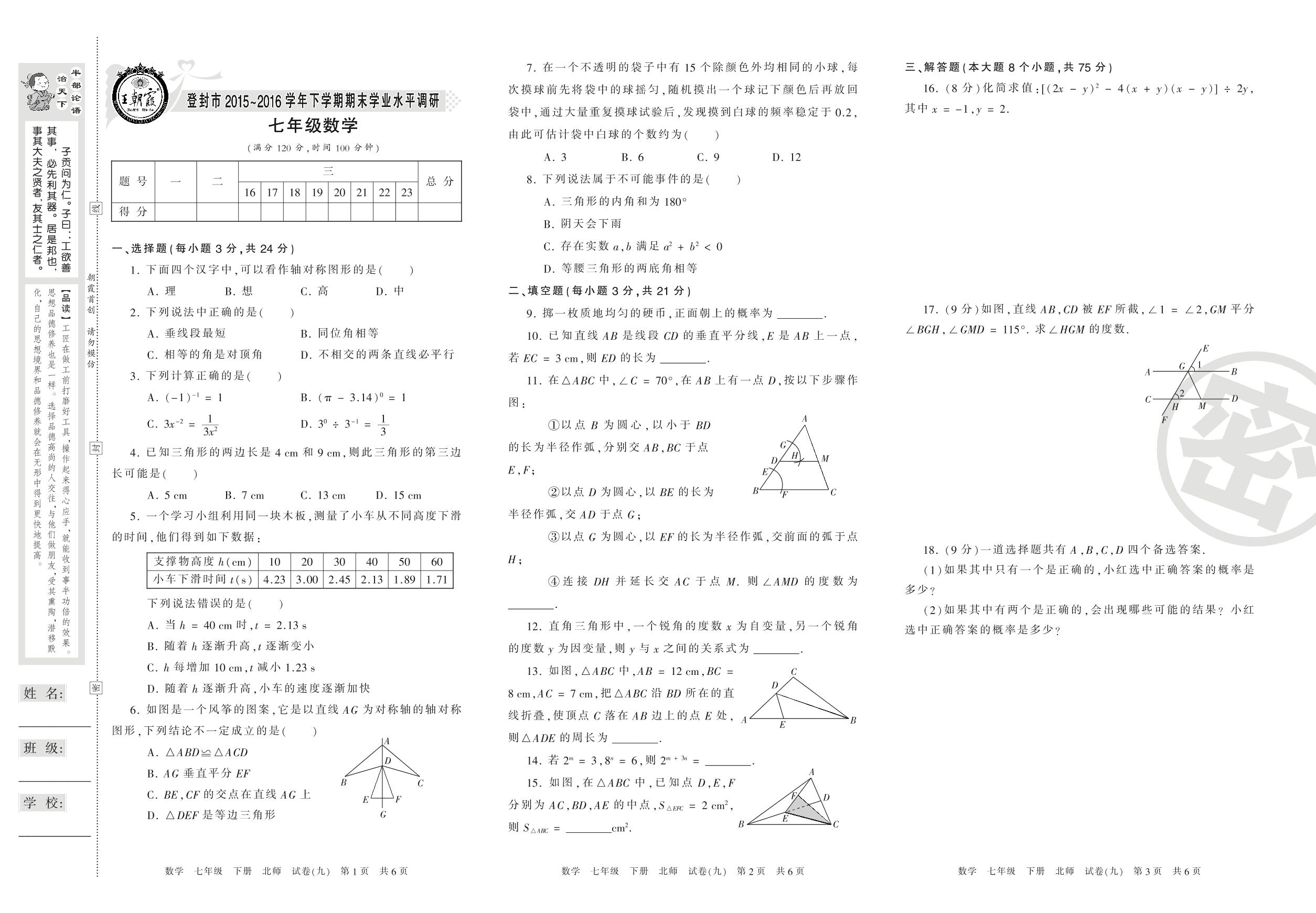 2015-2016学年第二学期登封市七年级数学试卷(北师版)【9】