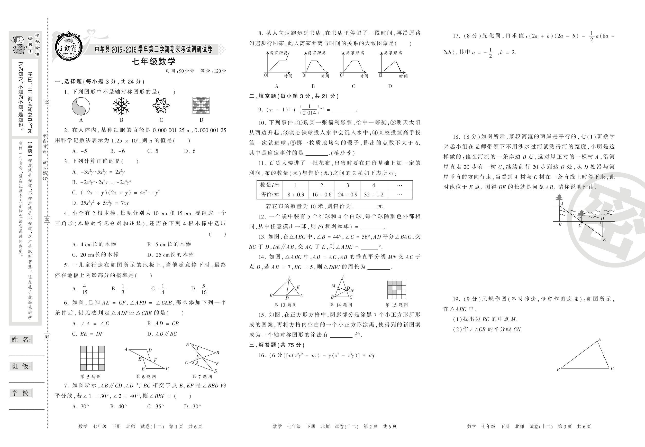 2015-2016学年第二学期郑州市中牟县七年级数学试卷(北师版)【12】