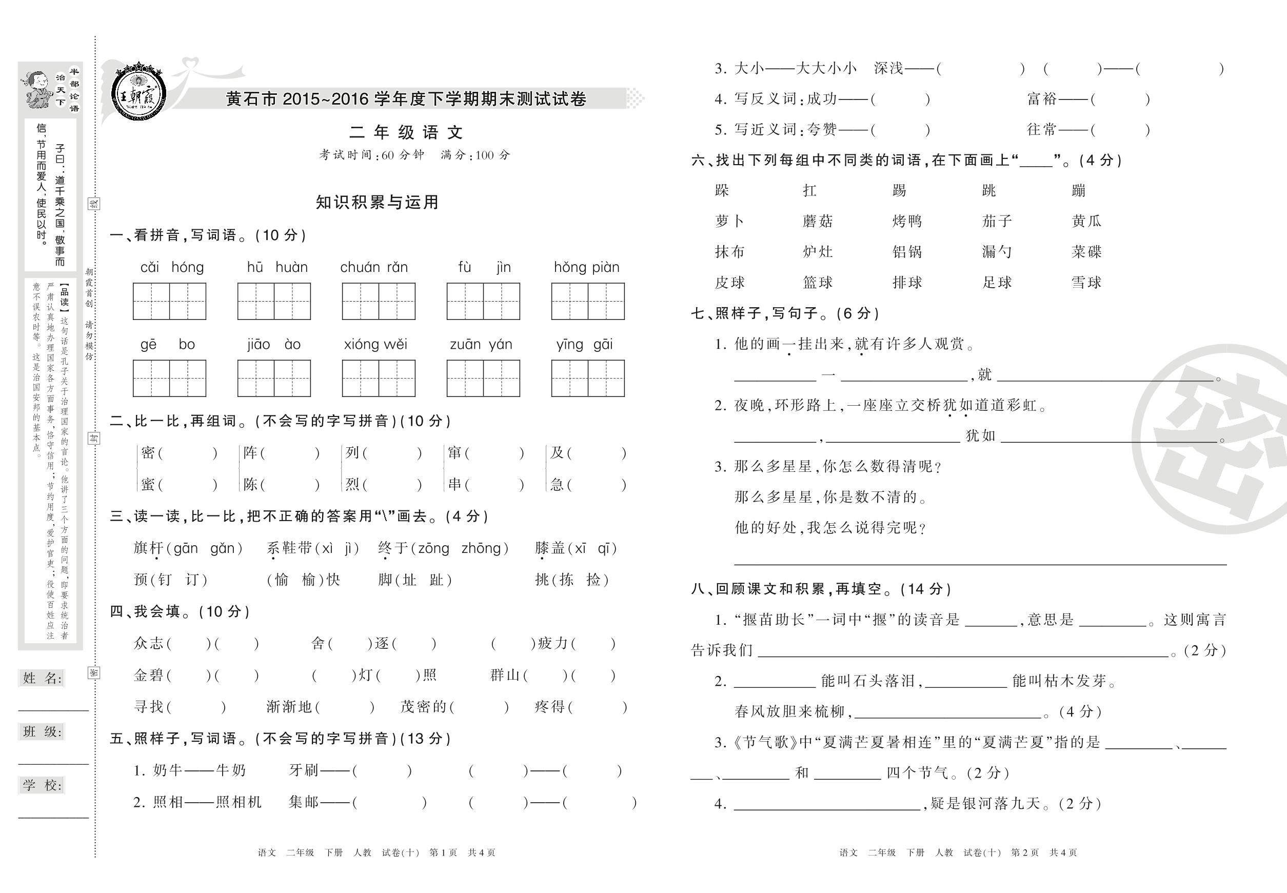 2015-2016学年第二学期黄石市二年级语文试卷(人教版)【10】