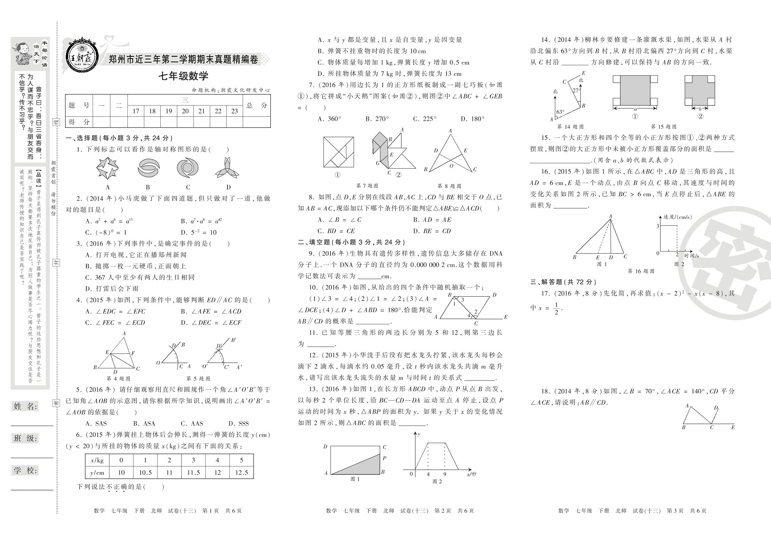 郑州市近三年精编七年级下册数学(北师版)【13】