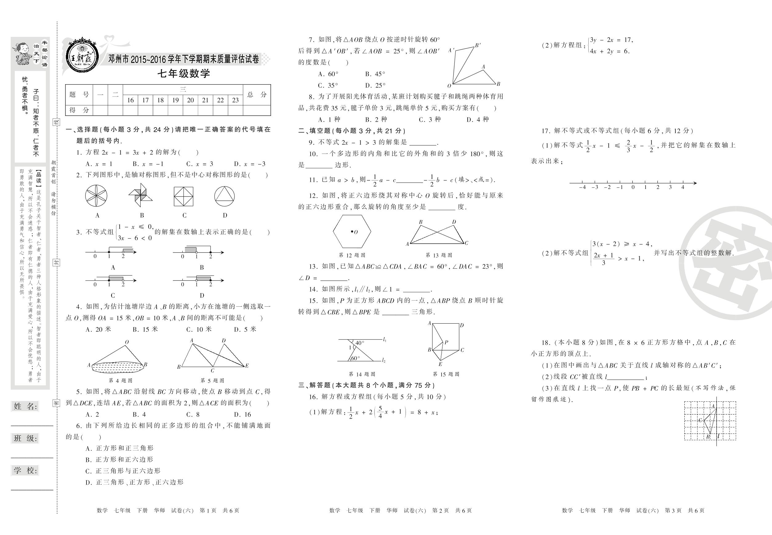 2015-2016学年第二学期邓州市七年级数学试卷(华师版)【6】