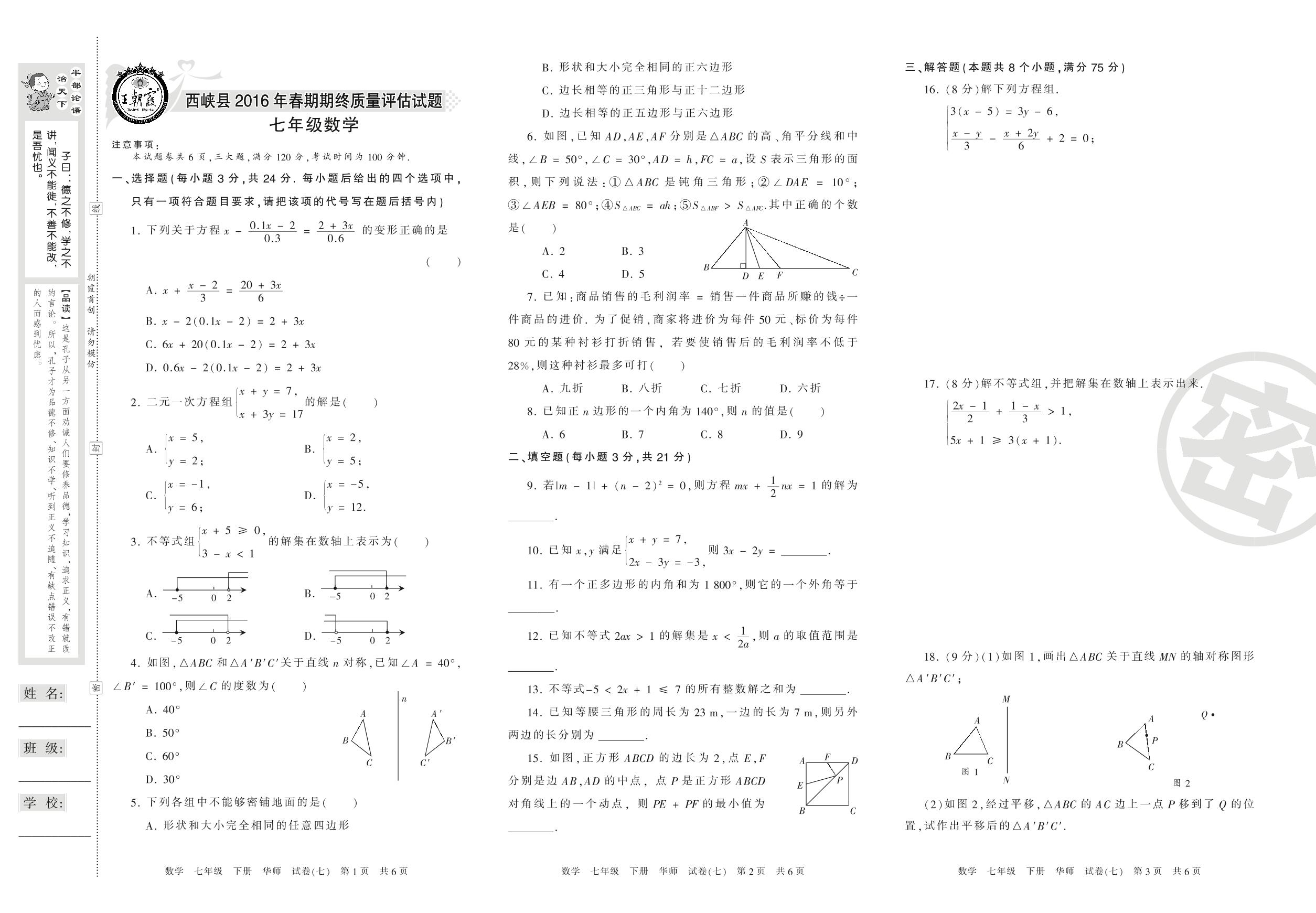 2015-2016学年第二学期南阳市西峡县七年级数学试卷(华师版)【7】