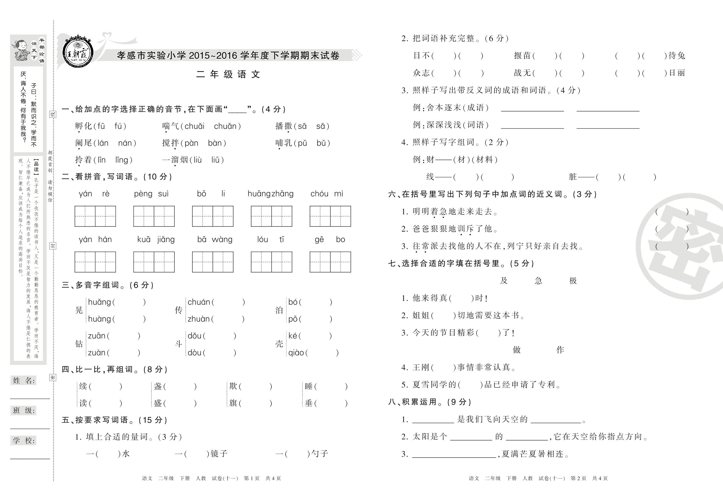 2015-2016学年第二学期孝感市二年级语文试卷(人教版)【11】