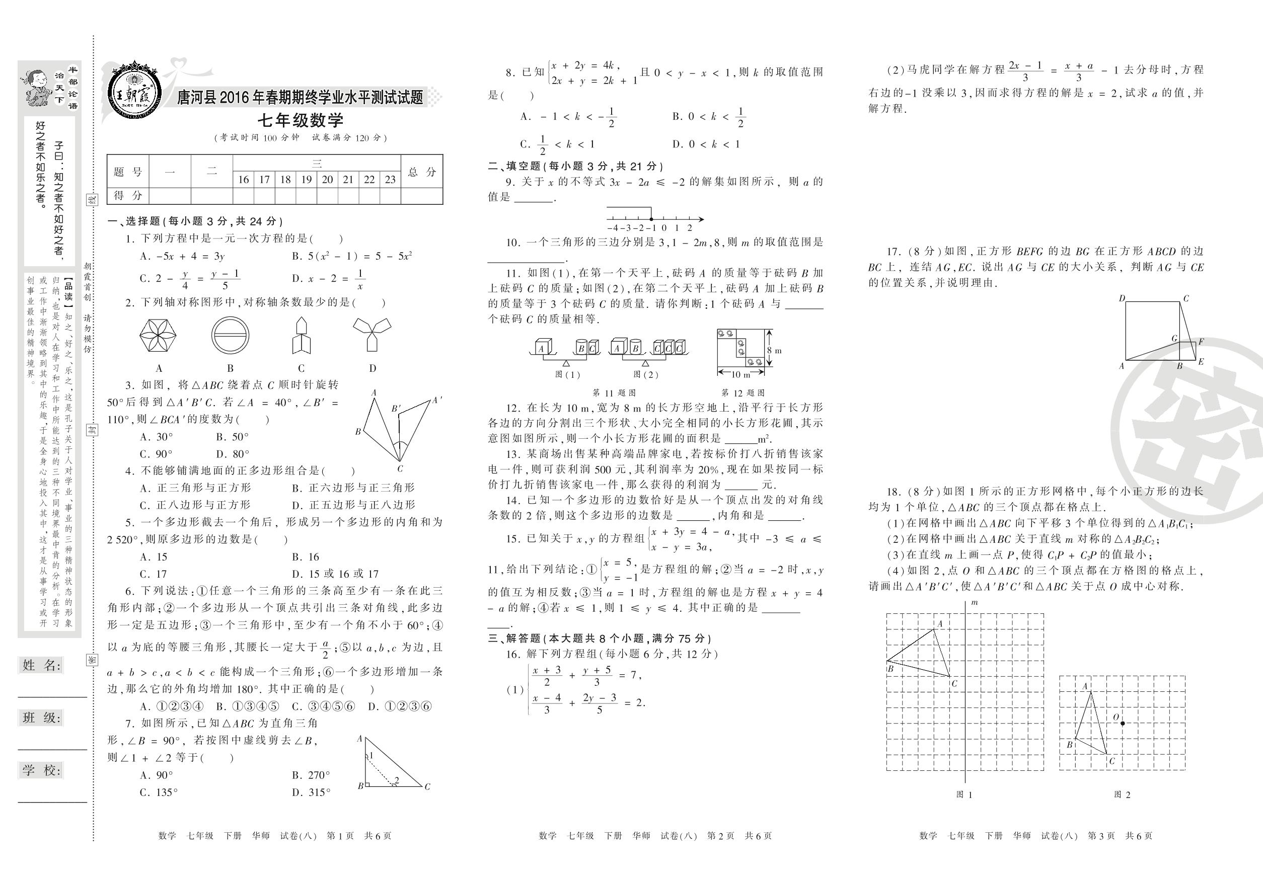 2015-2016学年第二学期南阳市唐河县七年级数学试卷(华师版)【8】