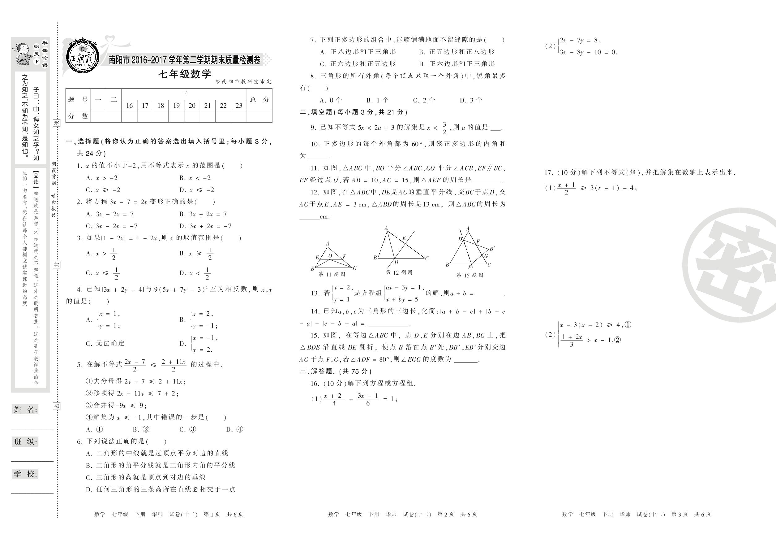 2015-2016学年第二学期南阳市七年级数学试卷(华师版)【12】