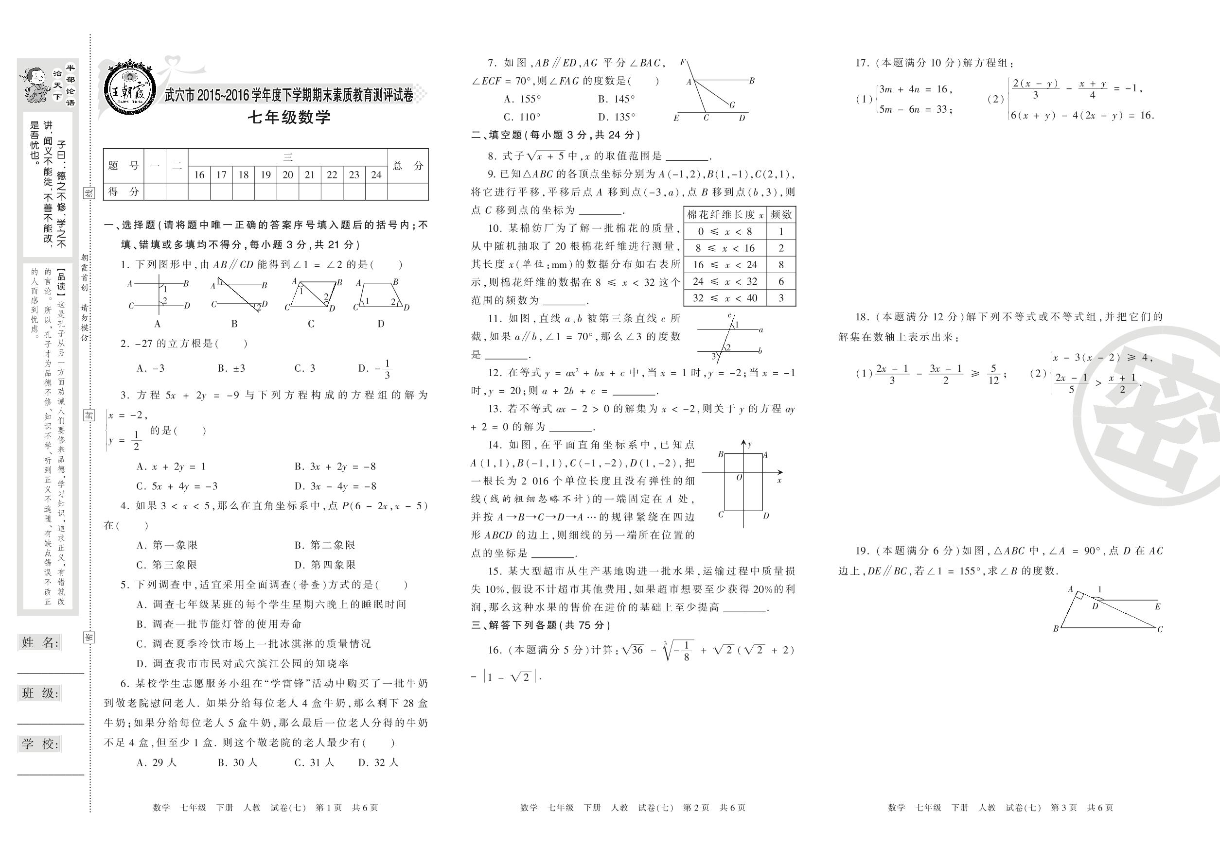 七年级数学人教版下册期末卷