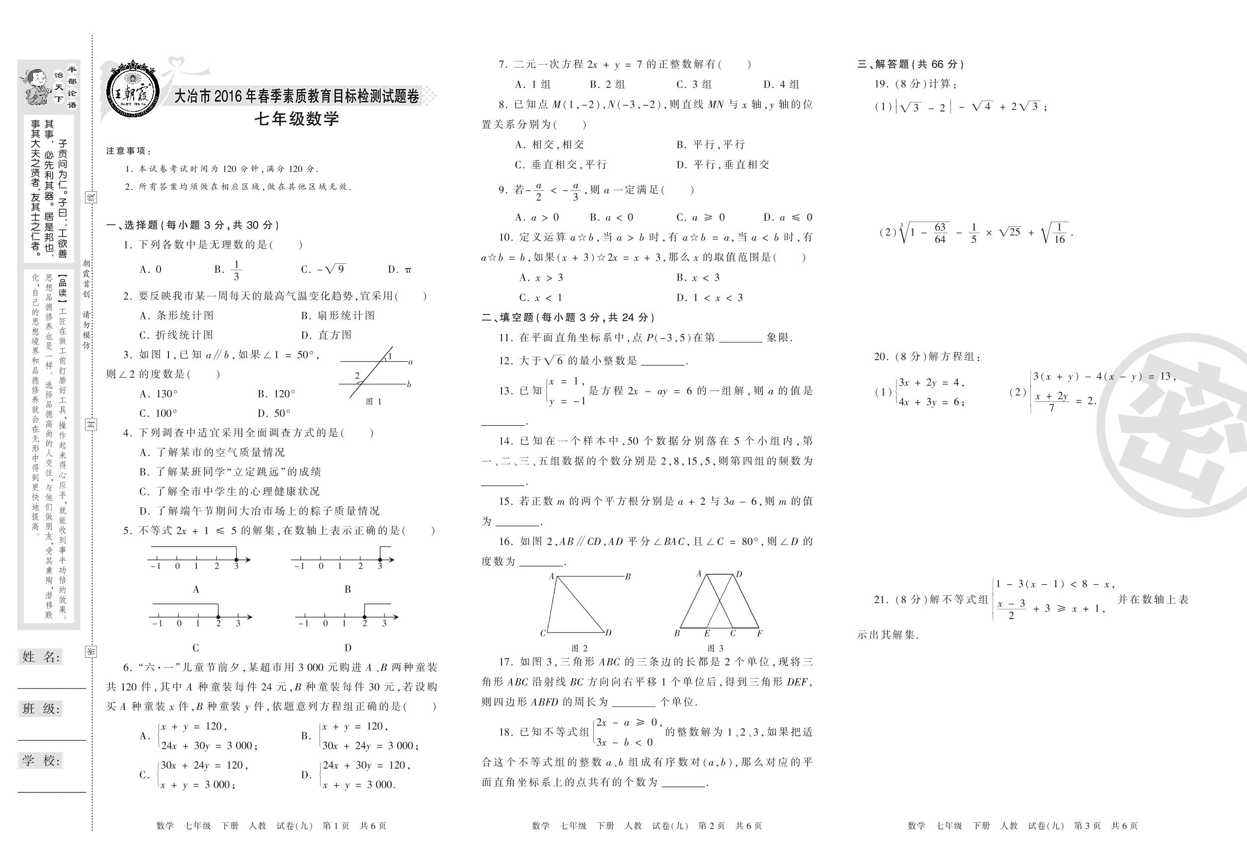 2015-2016学年第二学期大冶市七年级数学试卷(人教版)【9】