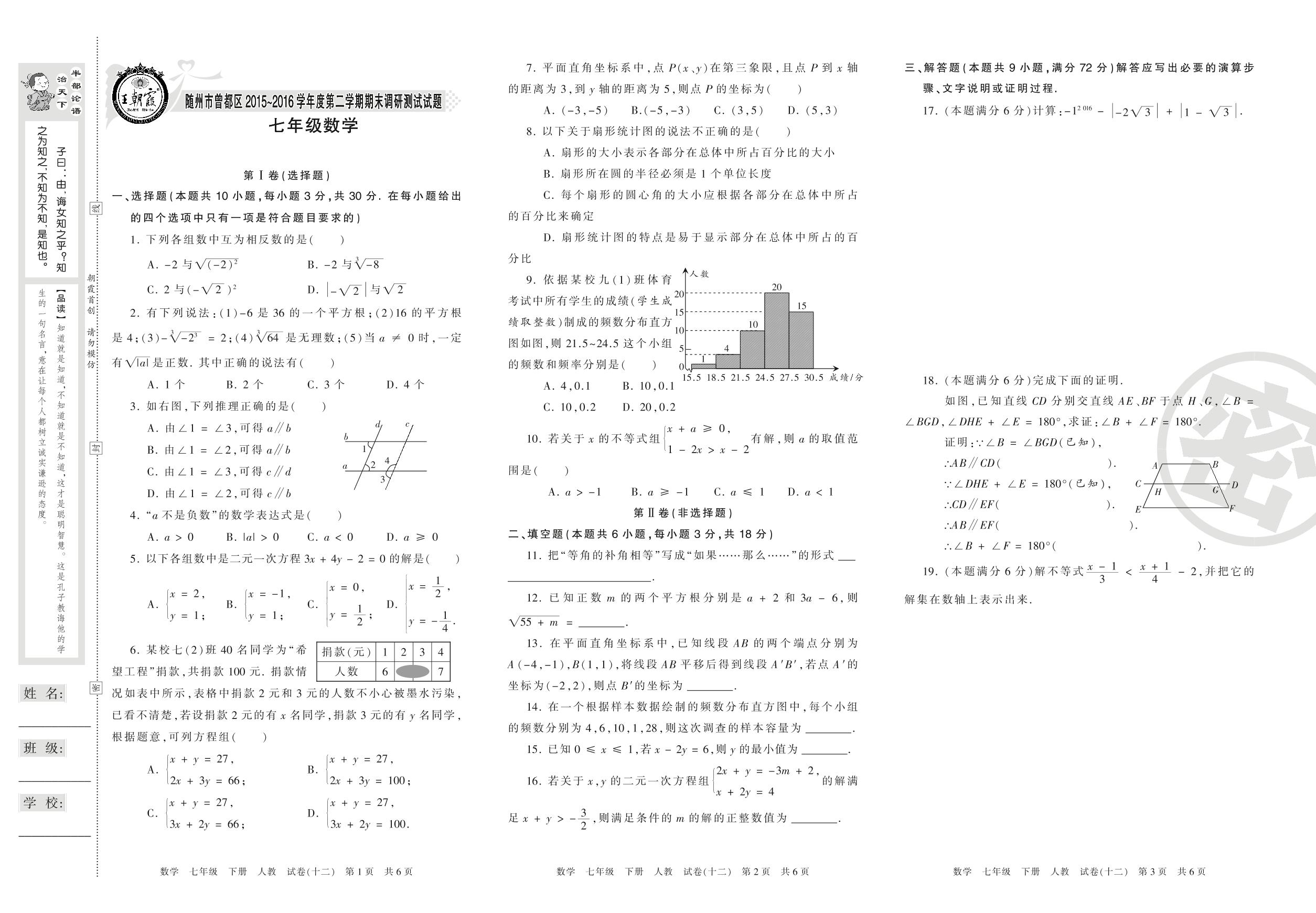 2015-2016学年第二学期随州市曾都区七年级数学试卷(人教版)【12】