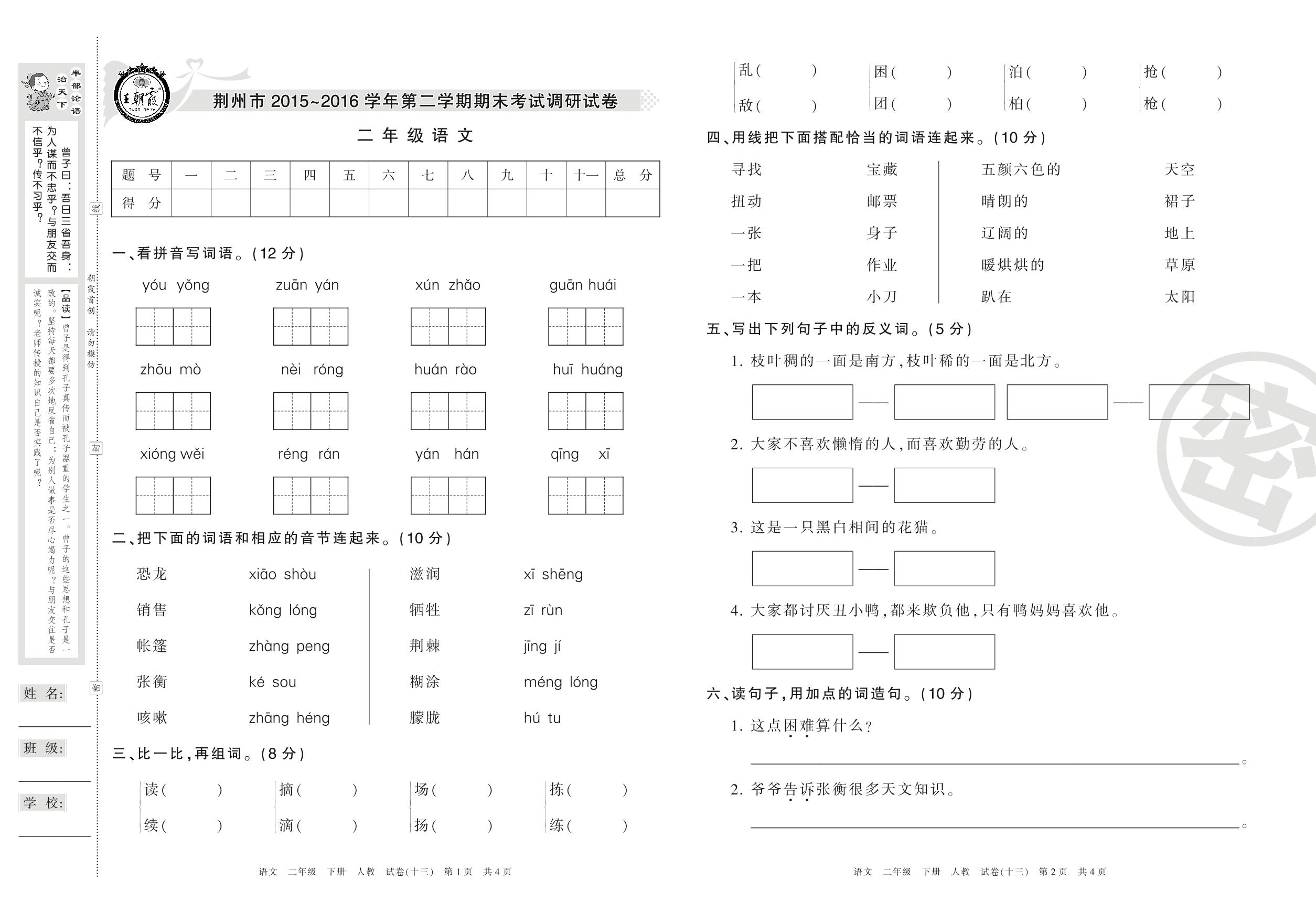 2015-2016学年第二学期荆州市二年级语文试卷(人教版)【13】